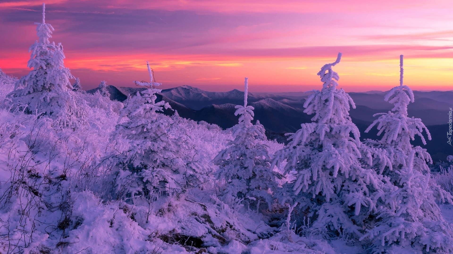 Edytor tapety: Ośnieżone świerki na tle gór Blue Ridge Mountain