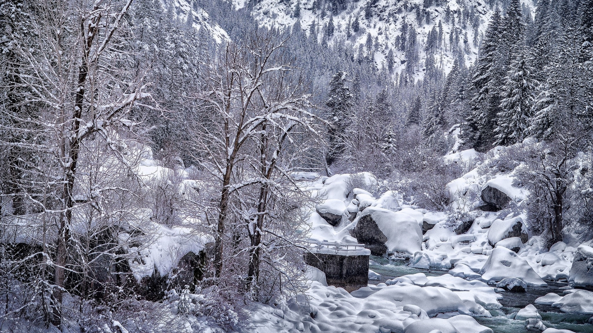 Edytor tapety: Śnieg na kamieniach i drzewach przy górskiej rzece