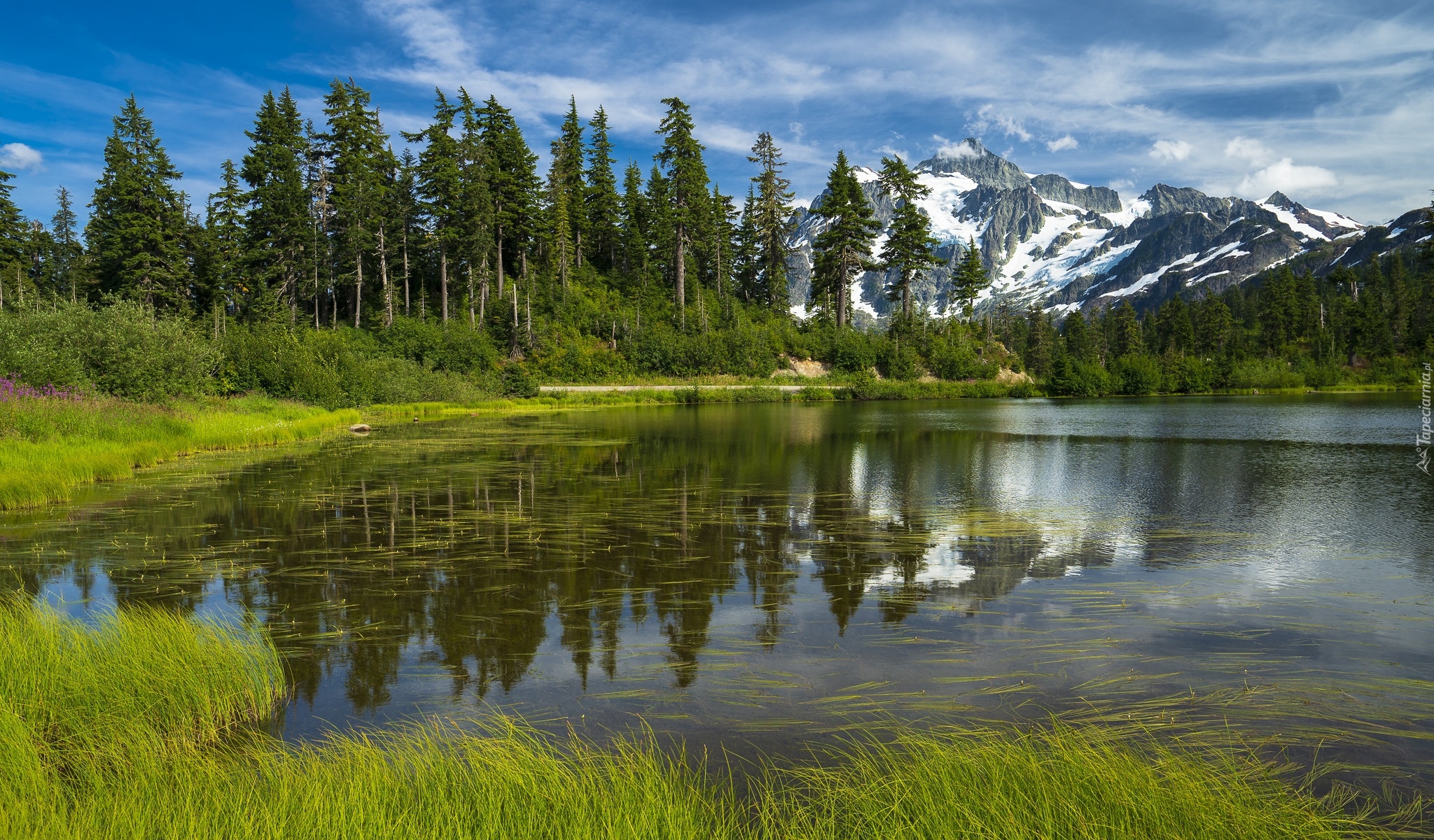 Edytor tapety: Odbicie zielonych drzew i gór w jeziorze
