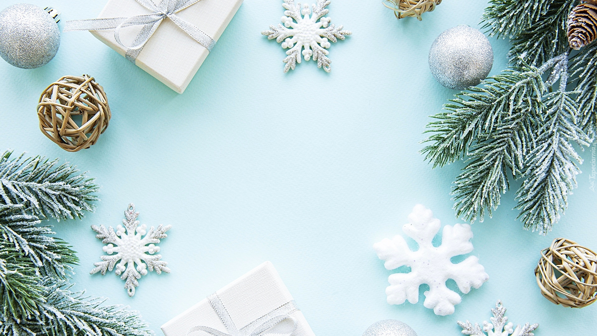 Edytor tapety: Prezenty i śnieżynki na niebieskim tle