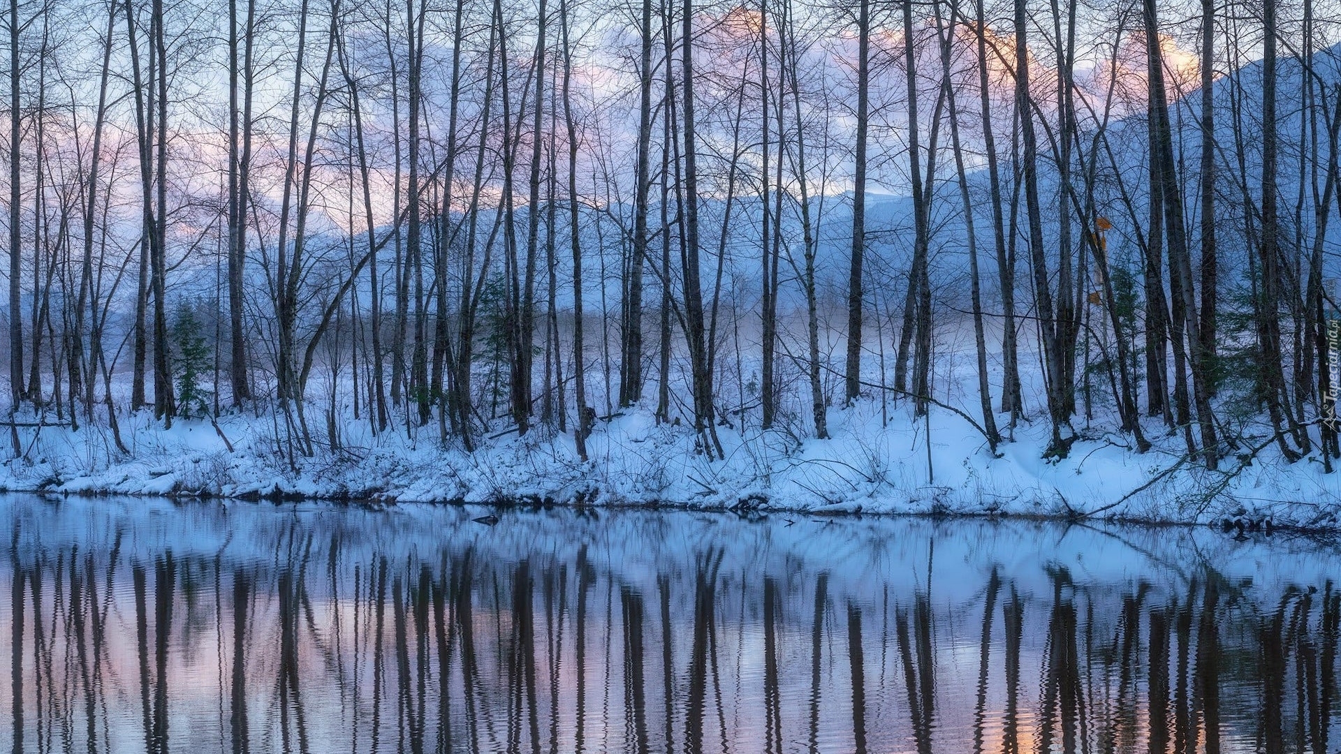 Edytor tapety: Bezlistne drzewa na brzegu rzeki