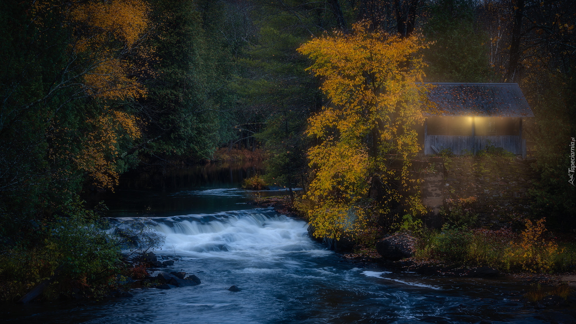 Edytor tapety: Oświetlona altana w jesiennym lesie przy rwącej rzece
