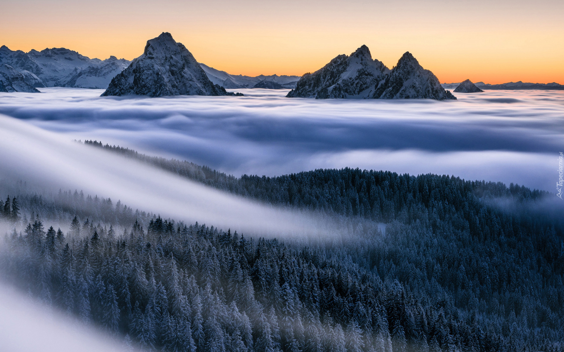 Edytor tapety: Gęsta mgła unosząca się nad lasami w górach
