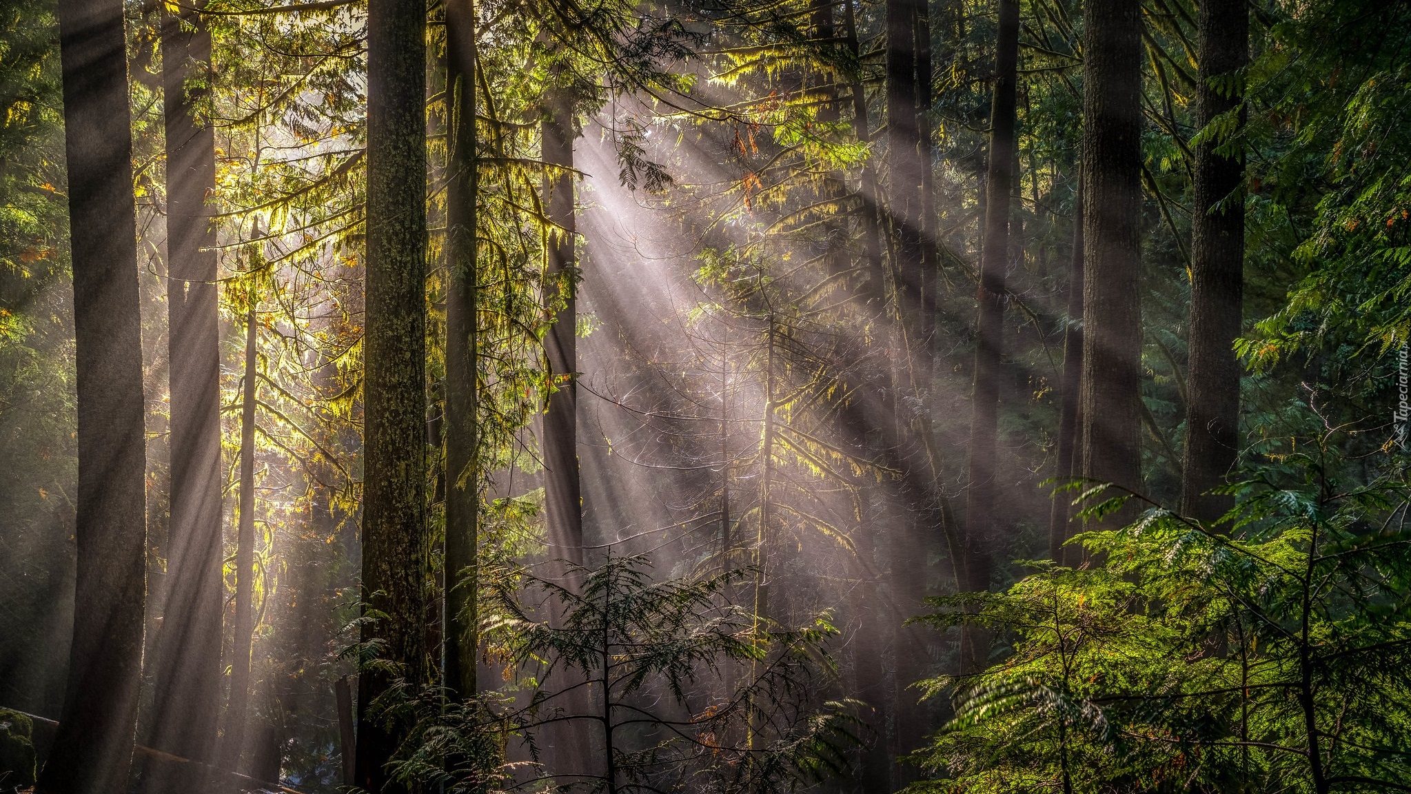 Edytor tapety: Smugi słonecznego światła w zielonym lesie