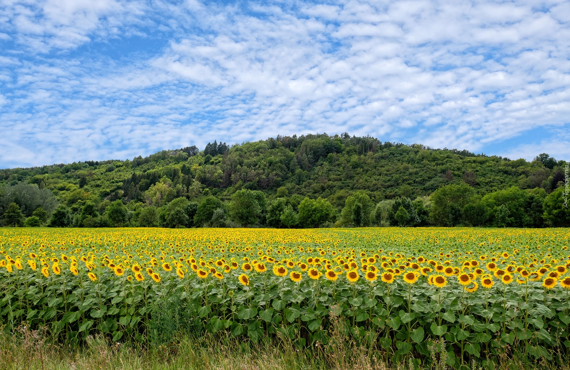 Edytor tapety: Słoneczniki na polu obok zalesionego wzgórza