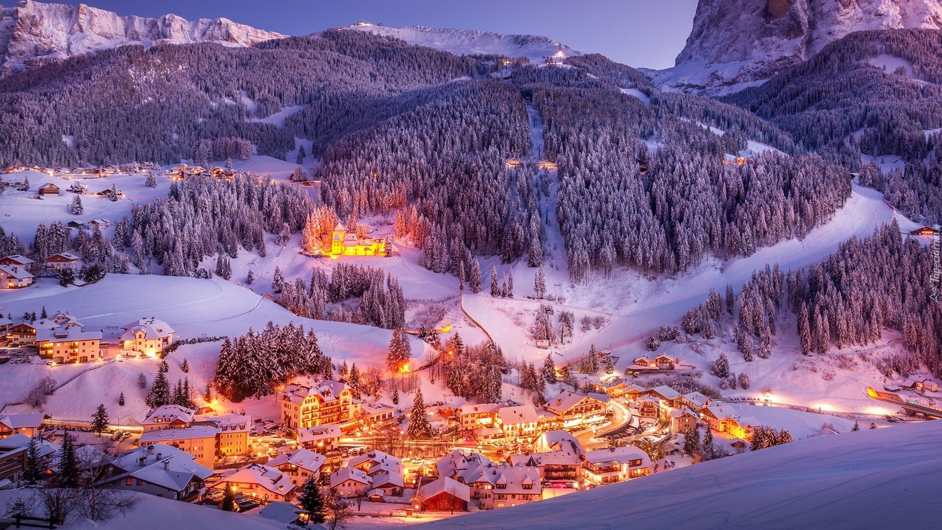 Edytor tapety: Oświetlone miasteczko w górskiej dolinie zimową porą