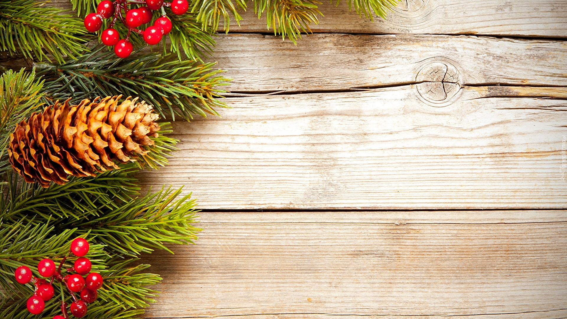 Edytor tapety: Gałązki z szyszkami i jagodami na deskach