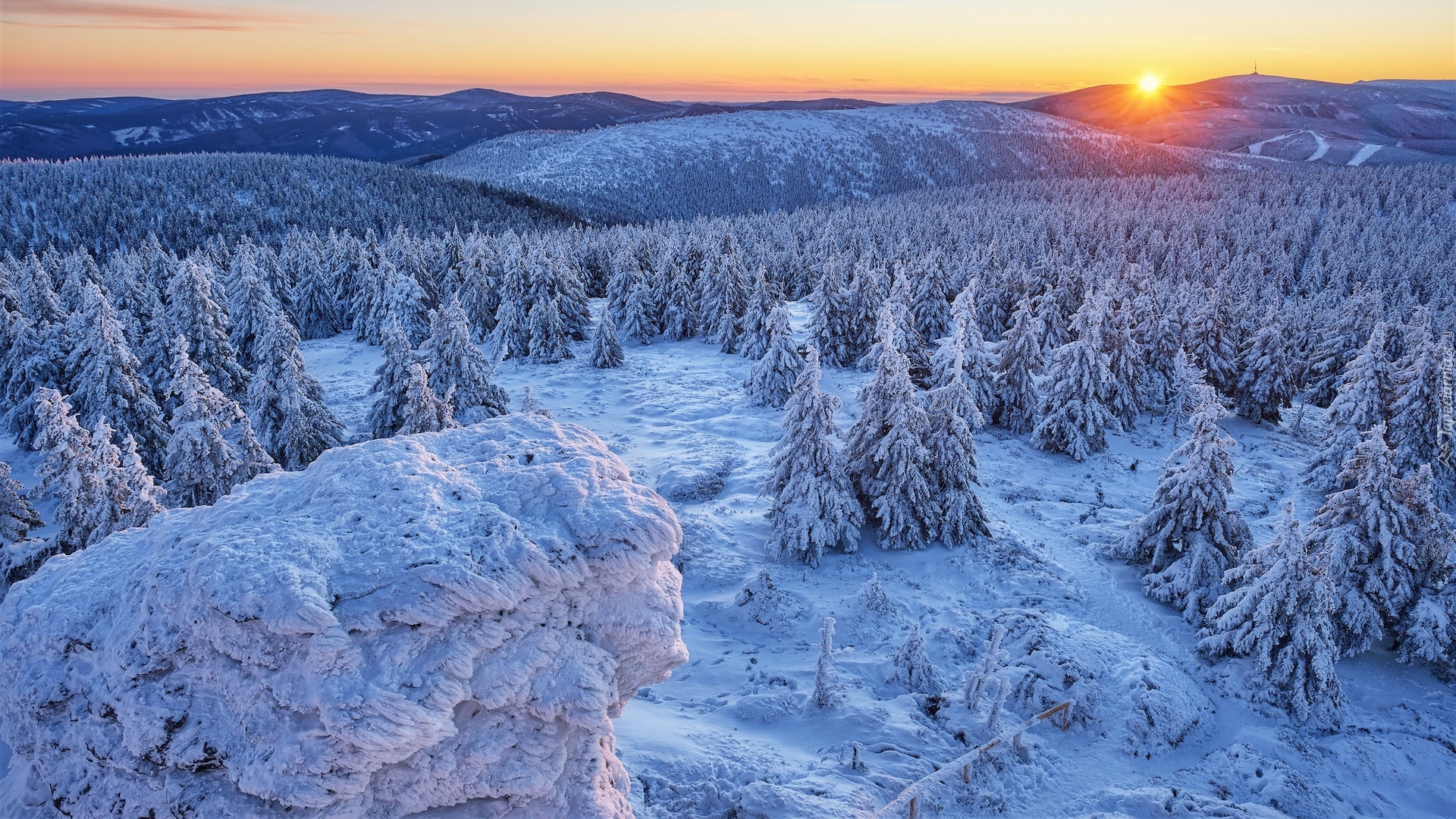Edytor tapety: Zimowy krajobraz zalesionych gór o wschodzie słońca