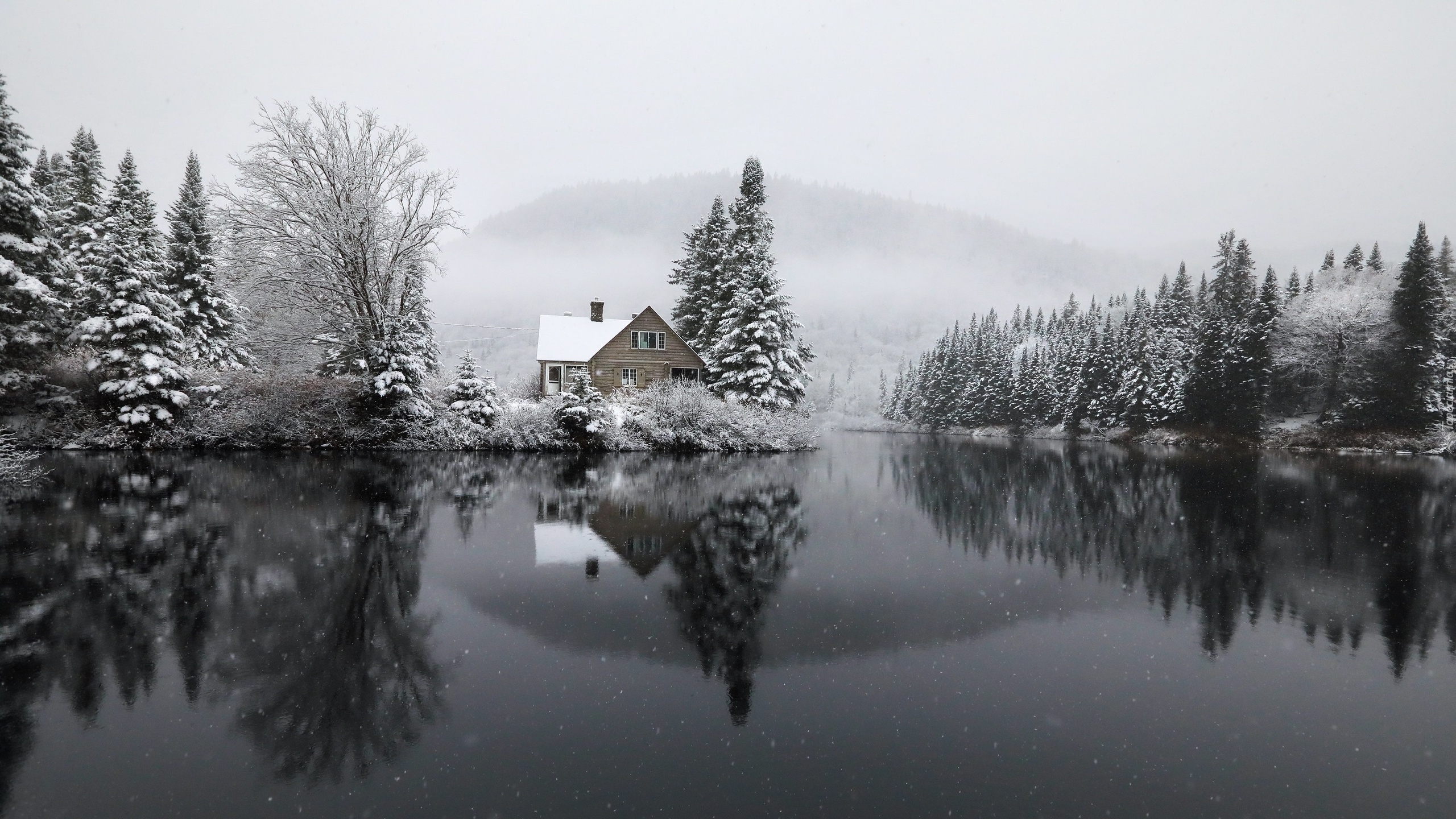 Edytor tapety: Świerki obok domu nad jeziorem