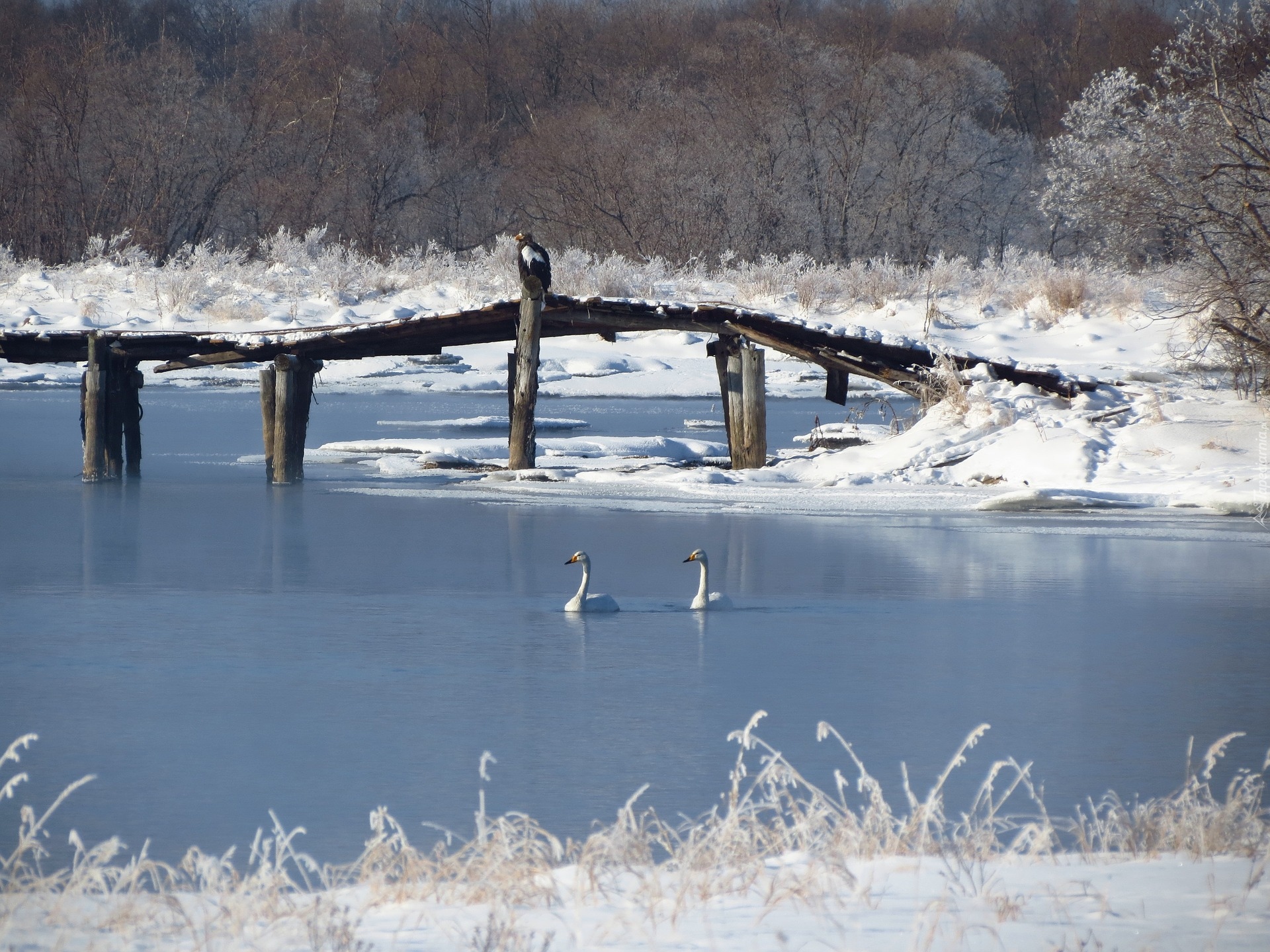 Edytor tapety: Bielik olbrzymi na pomoście i łabędzie na jeziorze