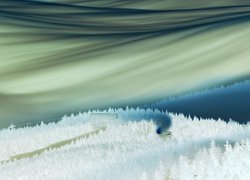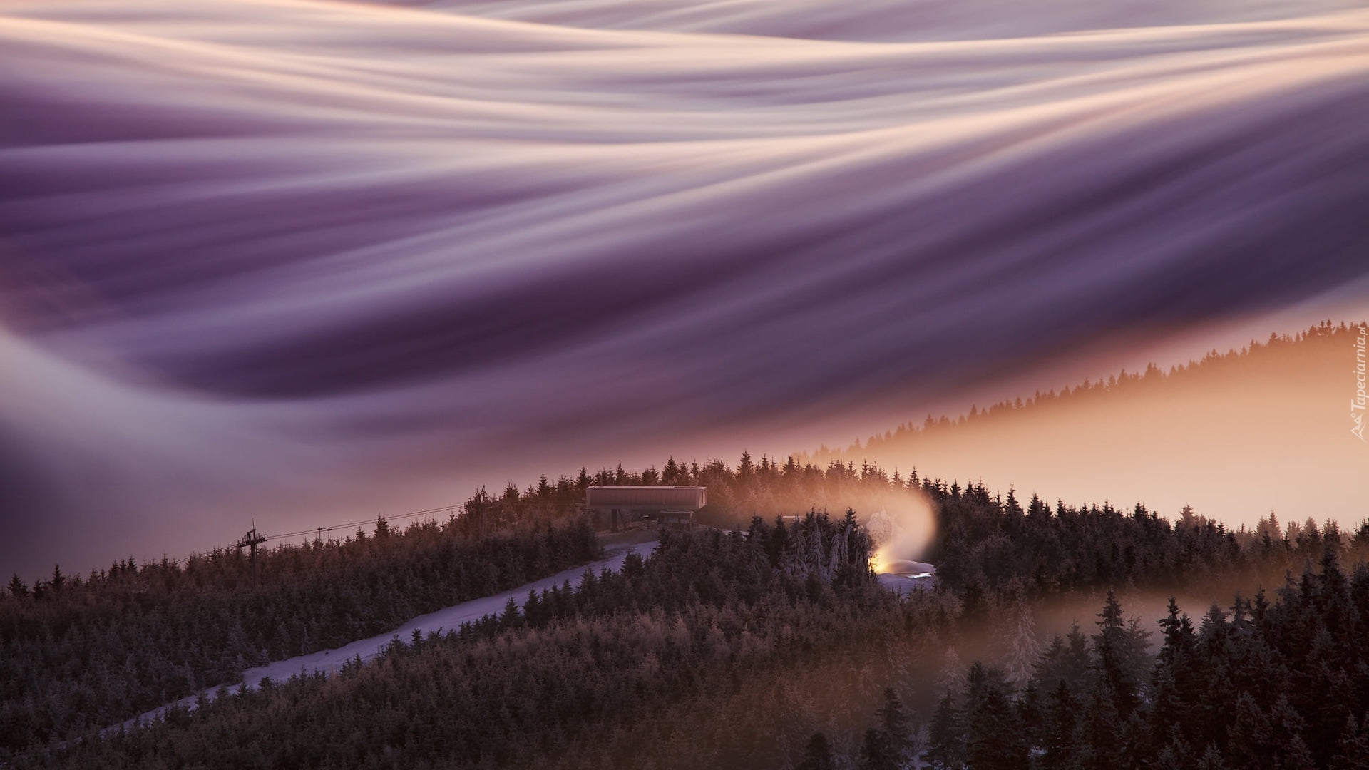 Edytor tapety: Góry pod mgłą i dom w środku lasu
