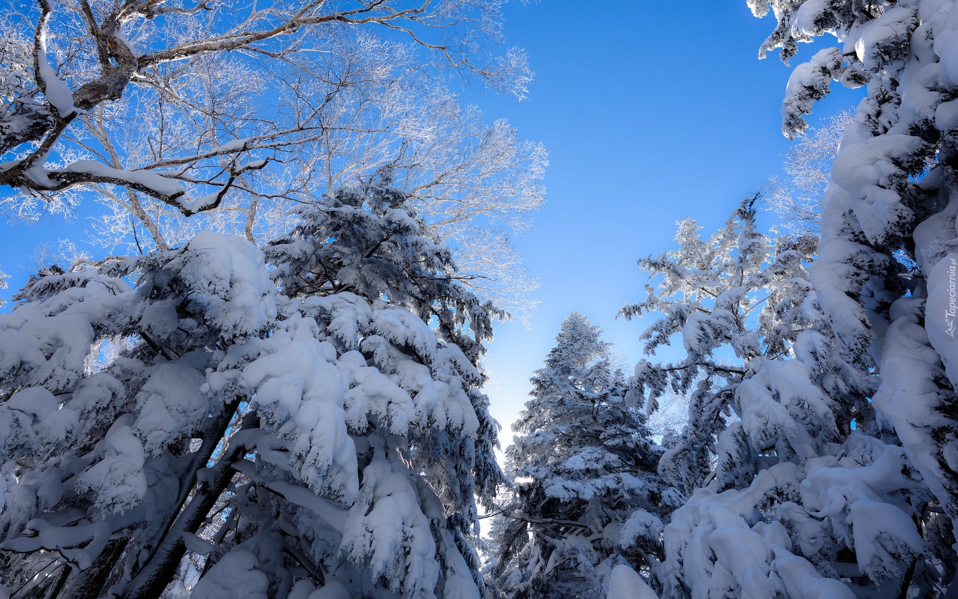 Edytor tapety: Ośnieżone wierzchołki drzew na tle błękitnego nieba