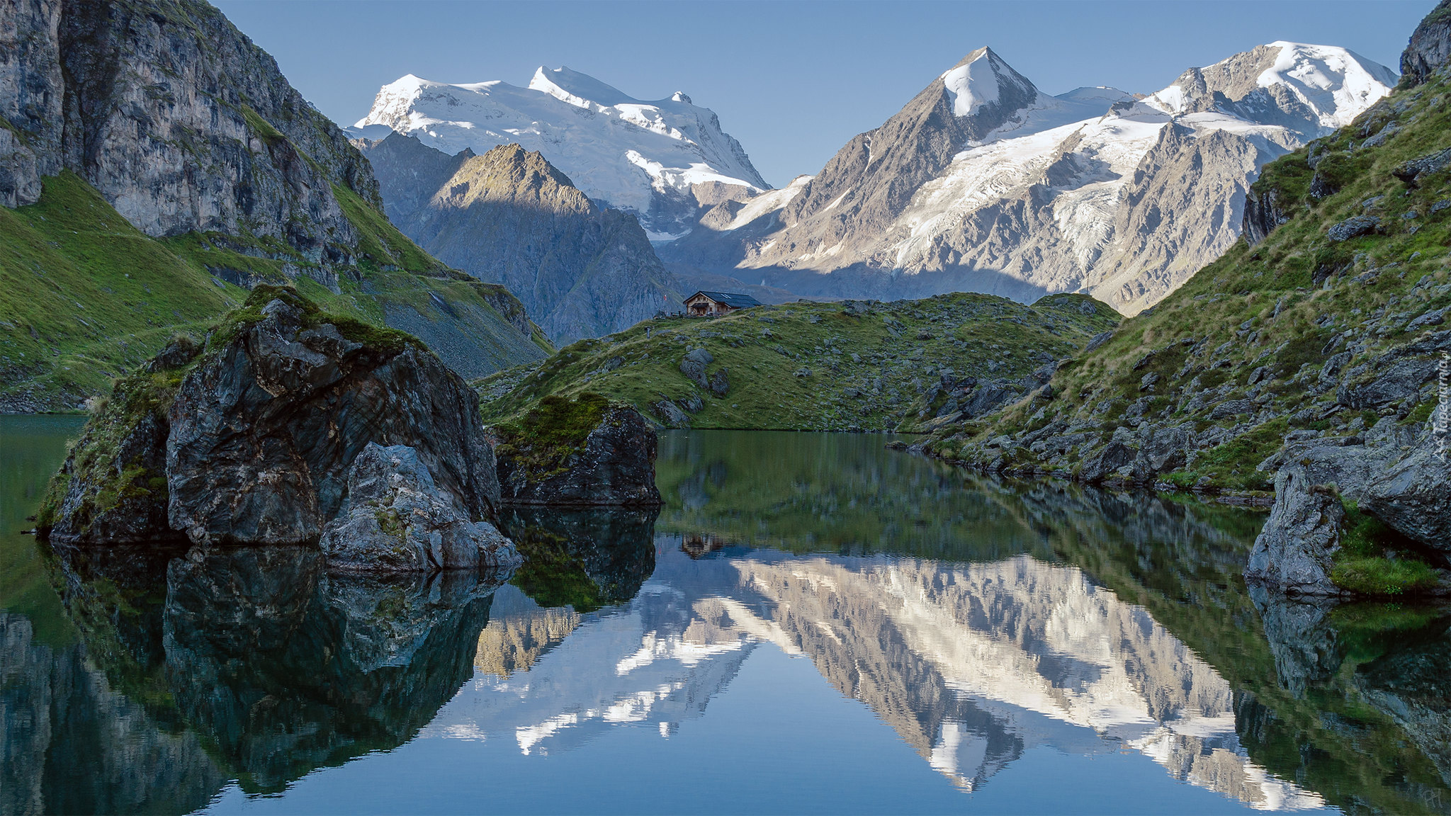 Edytor tapety: Odbicie skalistych ośnieżonych gór w jeziorze