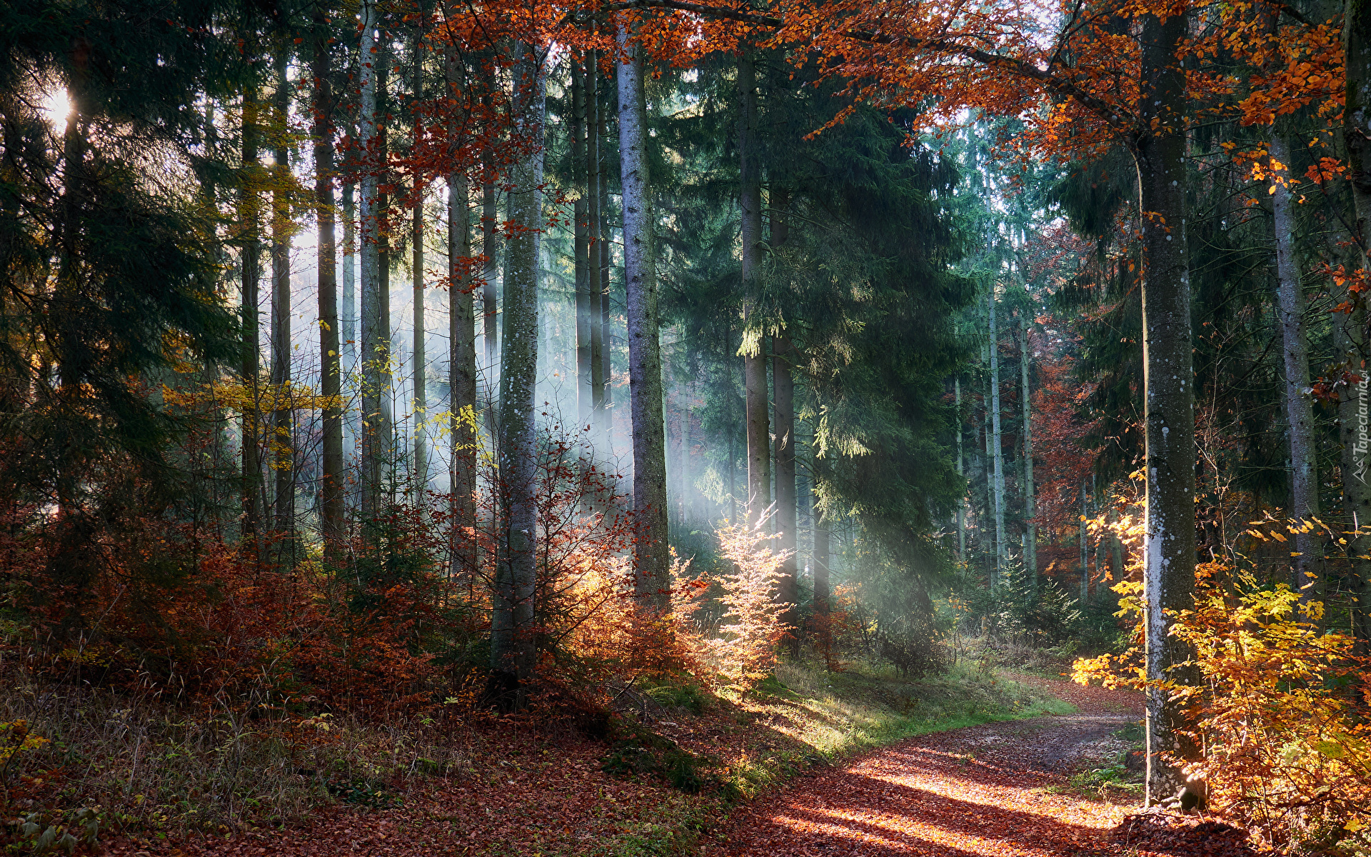 Edytor tapety: Droga w jesiennym lesie w promieniach słońca