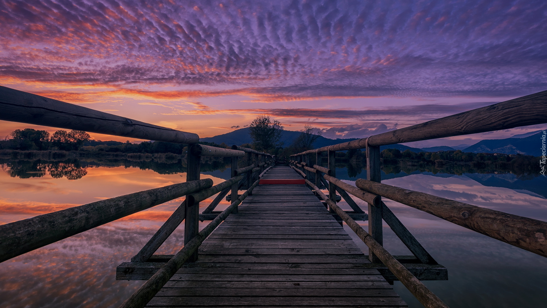 Edytor tapety: Drewniany most nad jeziorem o zachodzie słońca