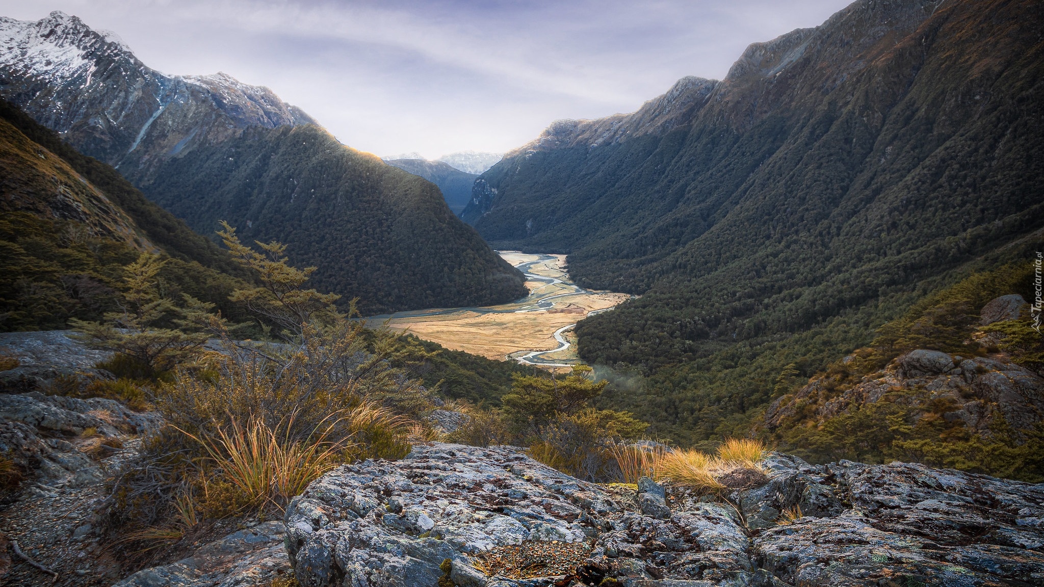 Edytor tapety: Rzeka w dolinie pośród zalesionych gór