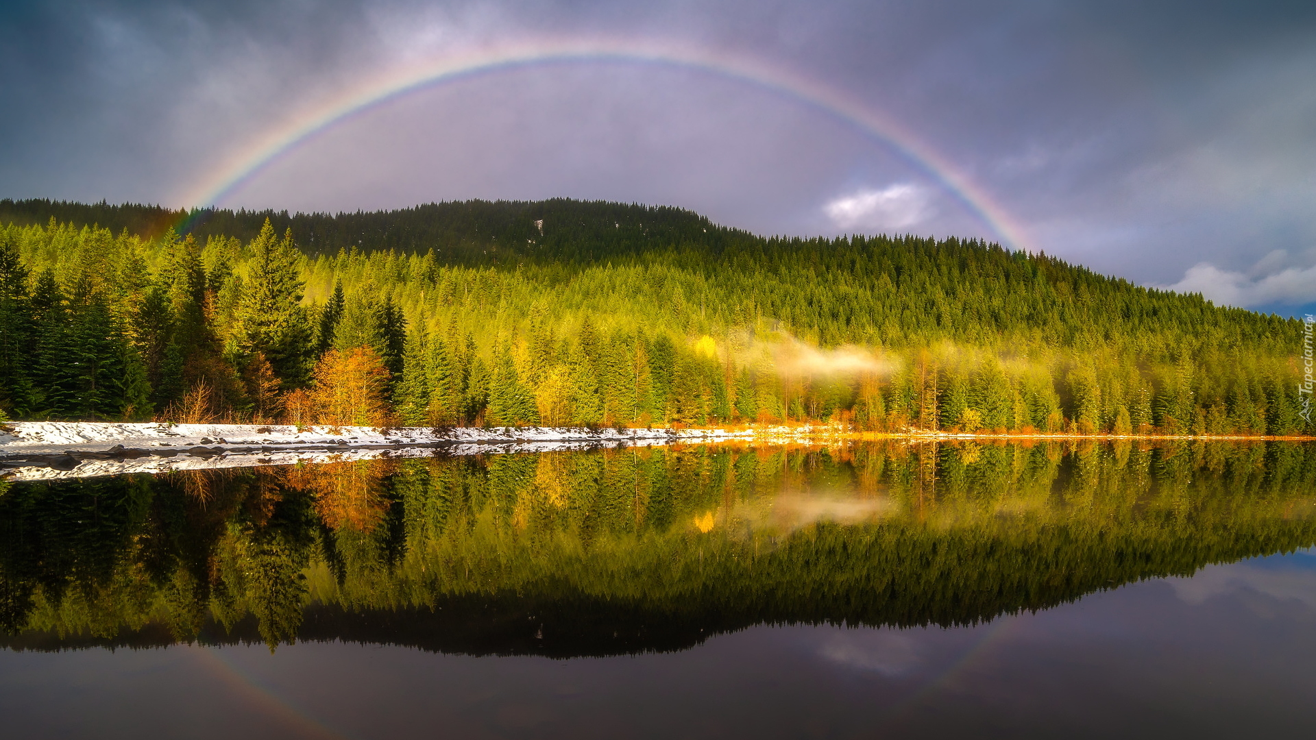 Edytor tapety: Tęcza nad lasem i jeziorem Trillium Lake