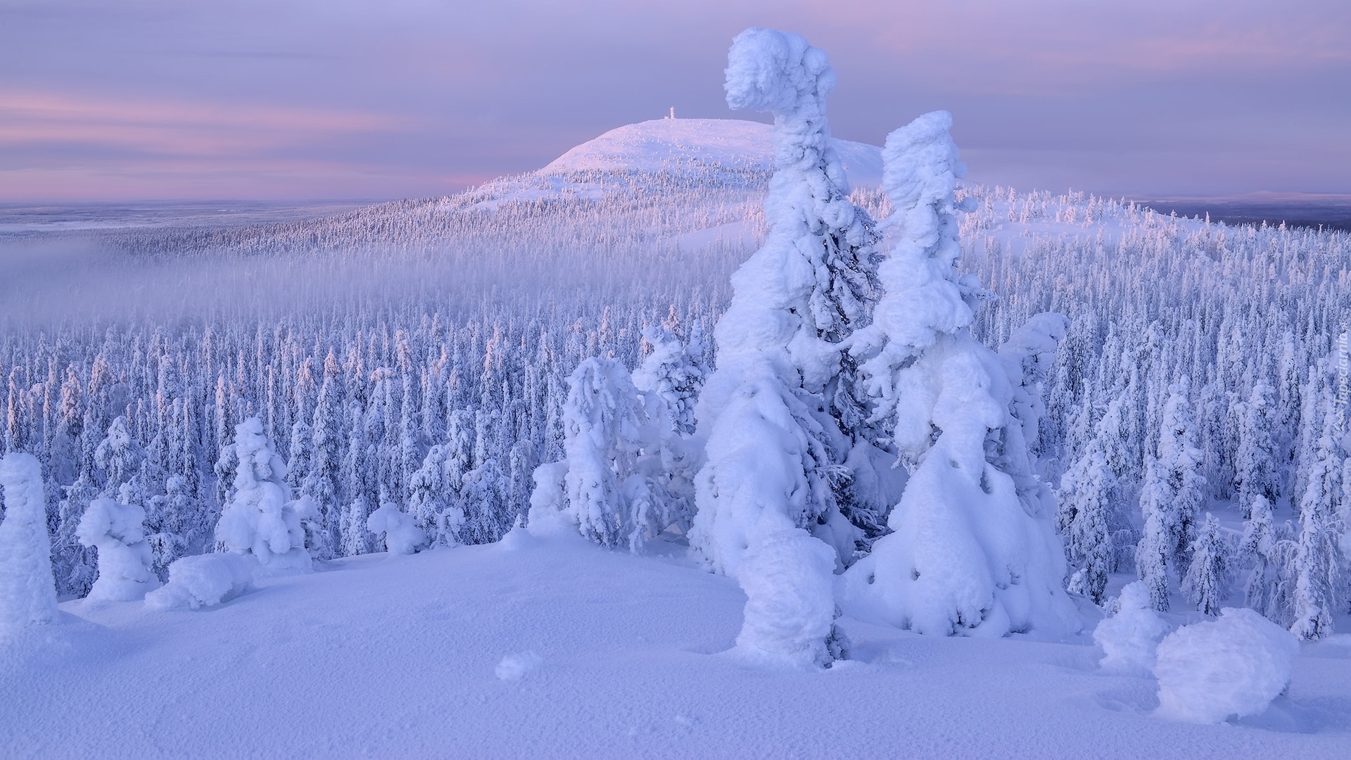 Edytor tapety: Zasypany śniegiem las na wzgórzu