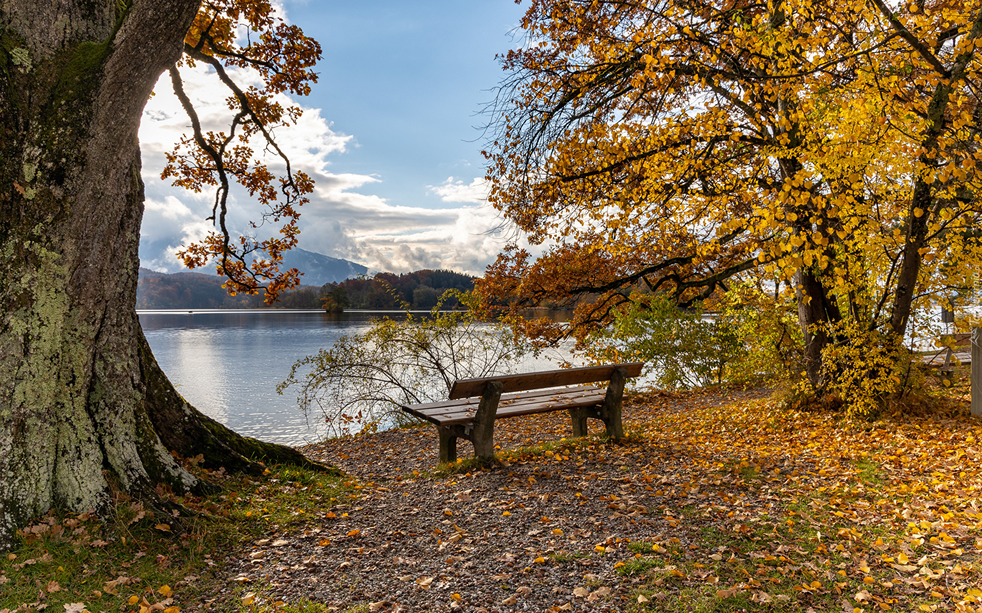 Edytor tapety: Ławka pod jesiennymi drzewami nad jeziorem Staffelsee