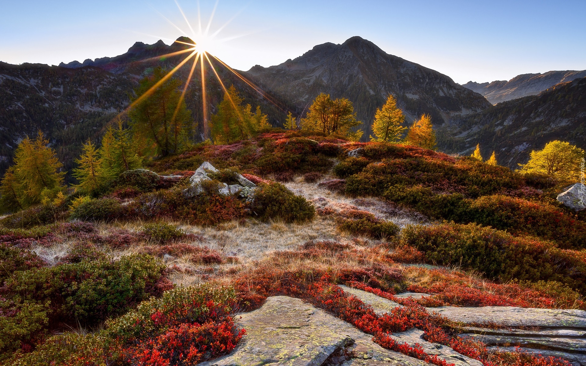 Edytor tapety: Kolorowa roślinność na tle opromienionych słońcem gór