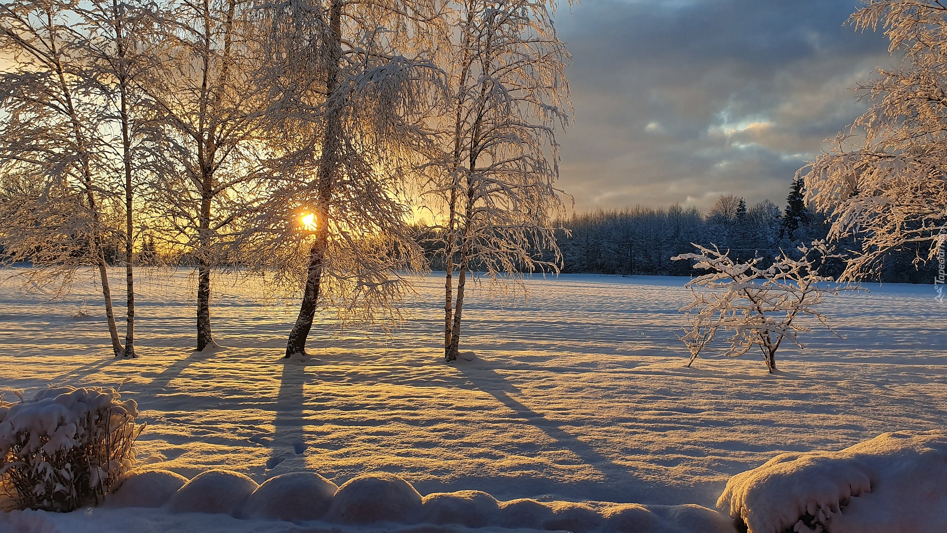 Edytor tapety: Ośnieżone brzozy w słonecznym blasku