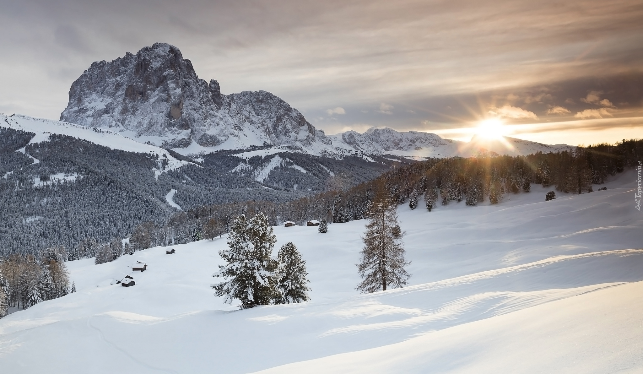 Edytor tapety: Zaśnieżone lasy i góry o wschodzie słońca