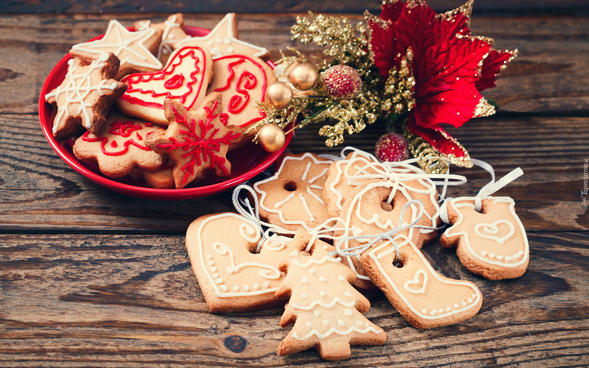 Edytor tapety: Świąteczne ciasteczka i stroik na deskach