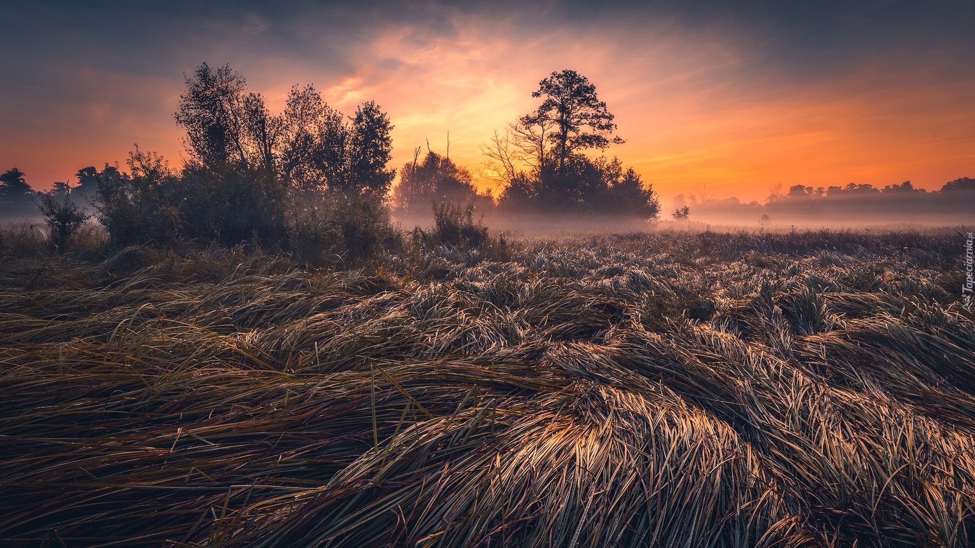 Edytor tapety: Wieczorna mgła unosząca się nad łąką