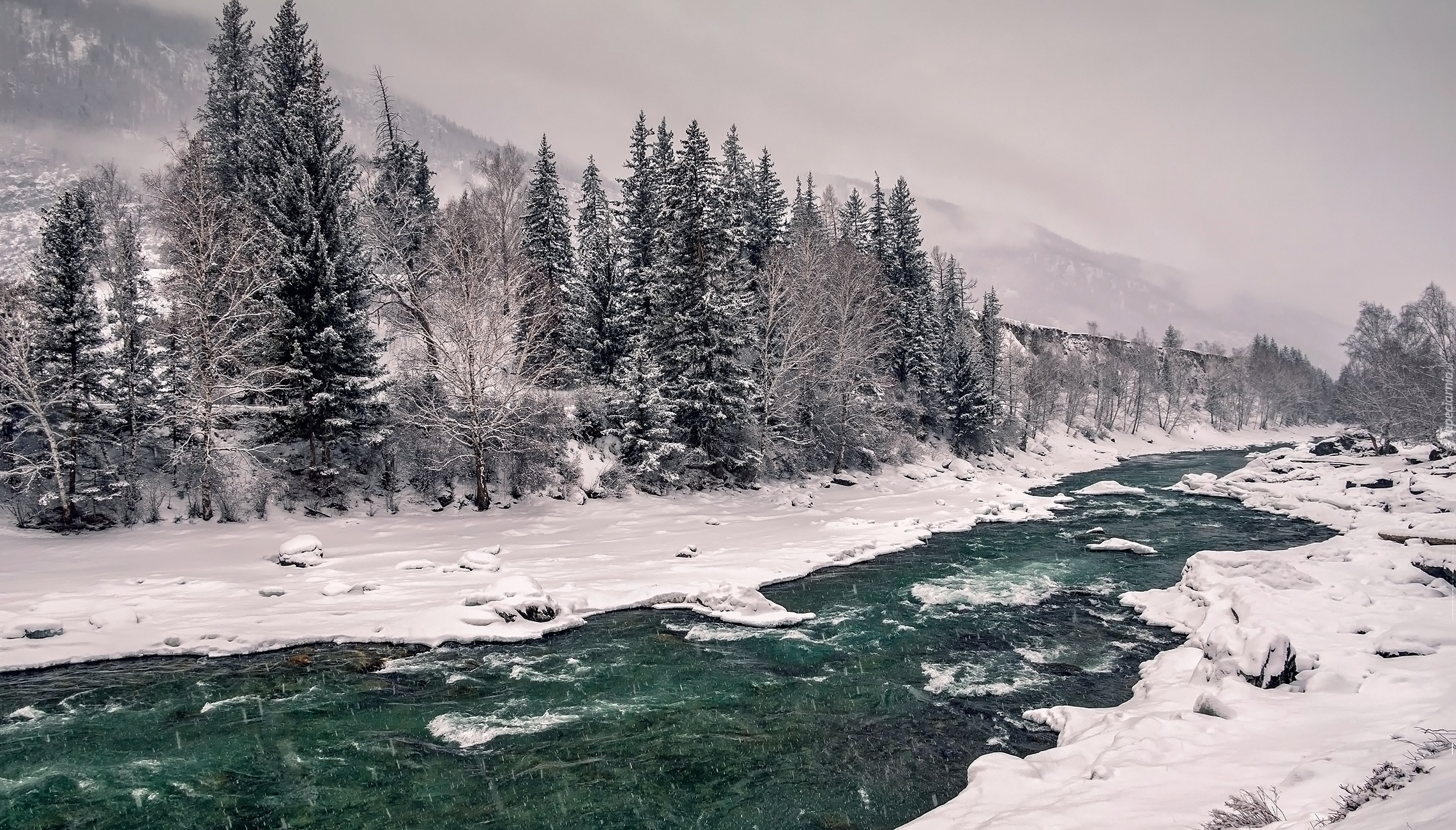 Edytor tapety: Ośnieżone drzewa nad rzeką w zamglonych górach