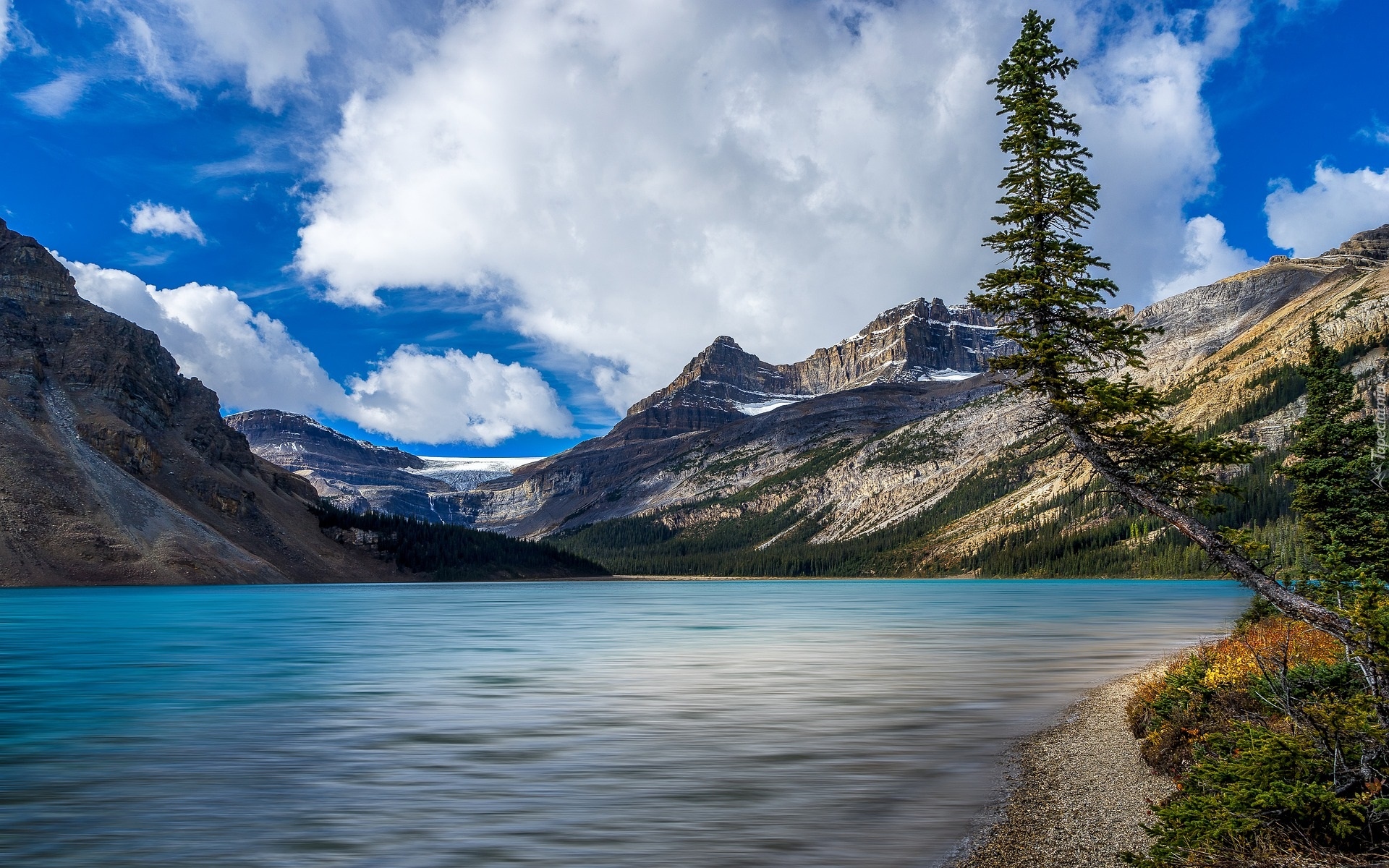Edytor tapety: Pochylone drzewo nad jeziorem Bow Lake