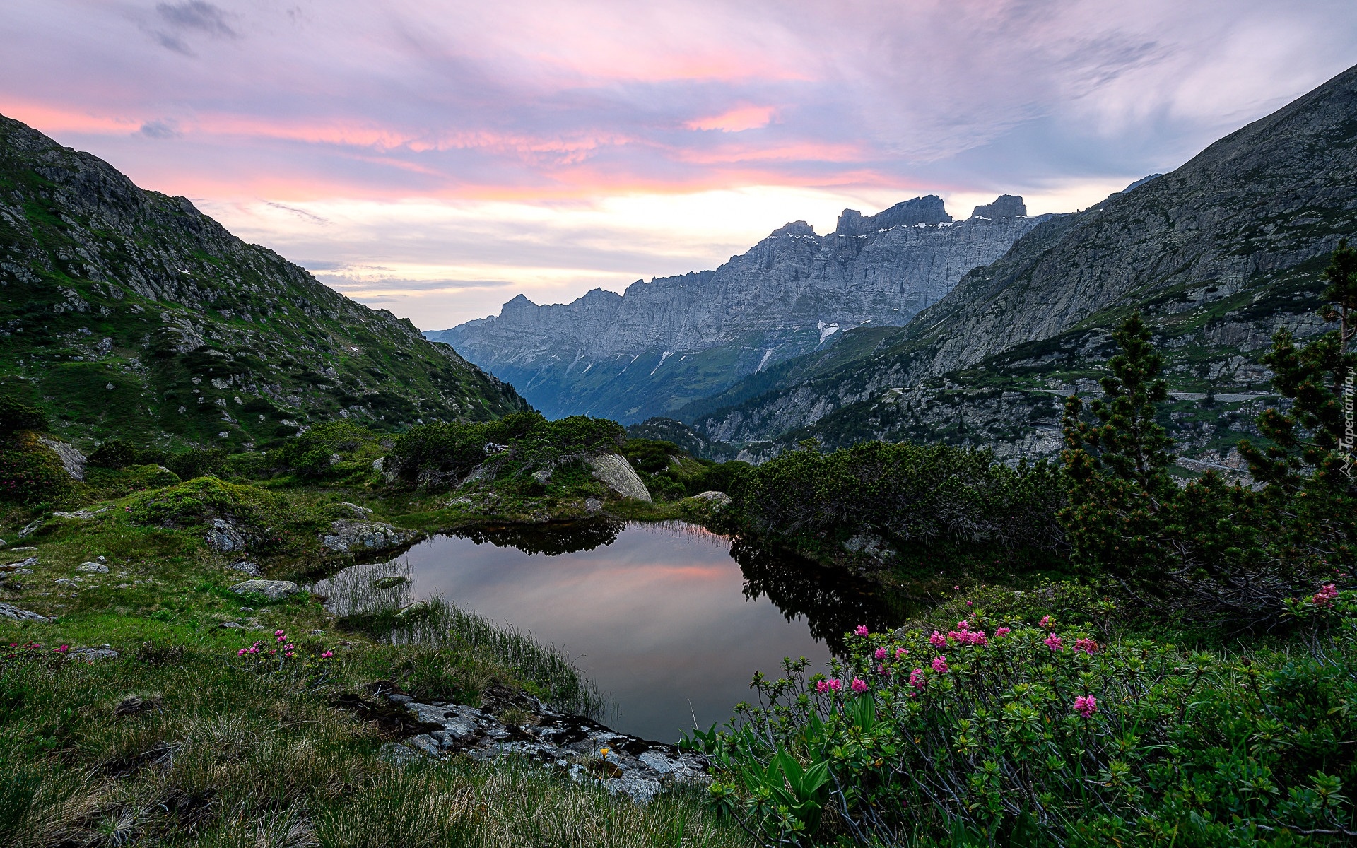 Edytor tapety: Różanecznik nad wodą i widok na góry