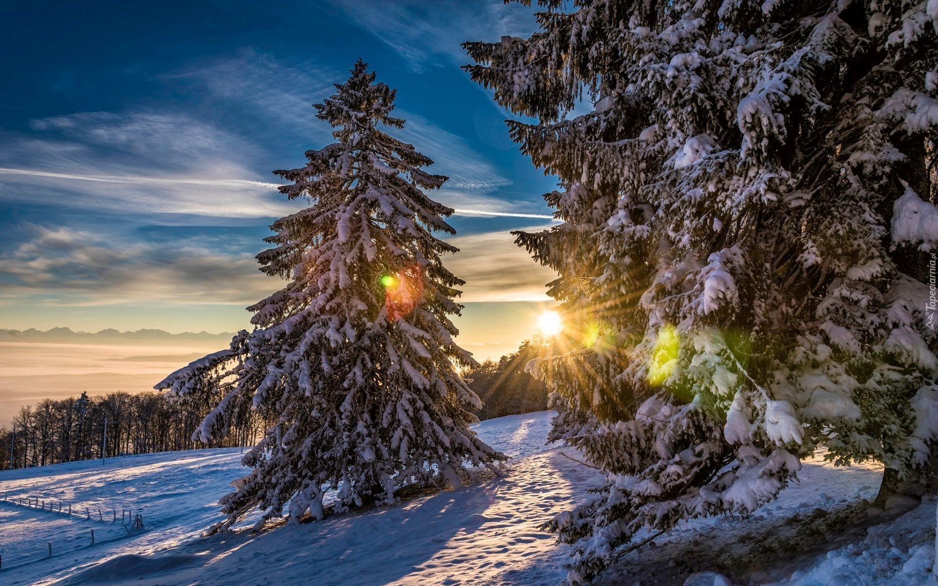Edytor tapety: Ośnieżone świerki w blasku zachodzącego słońca