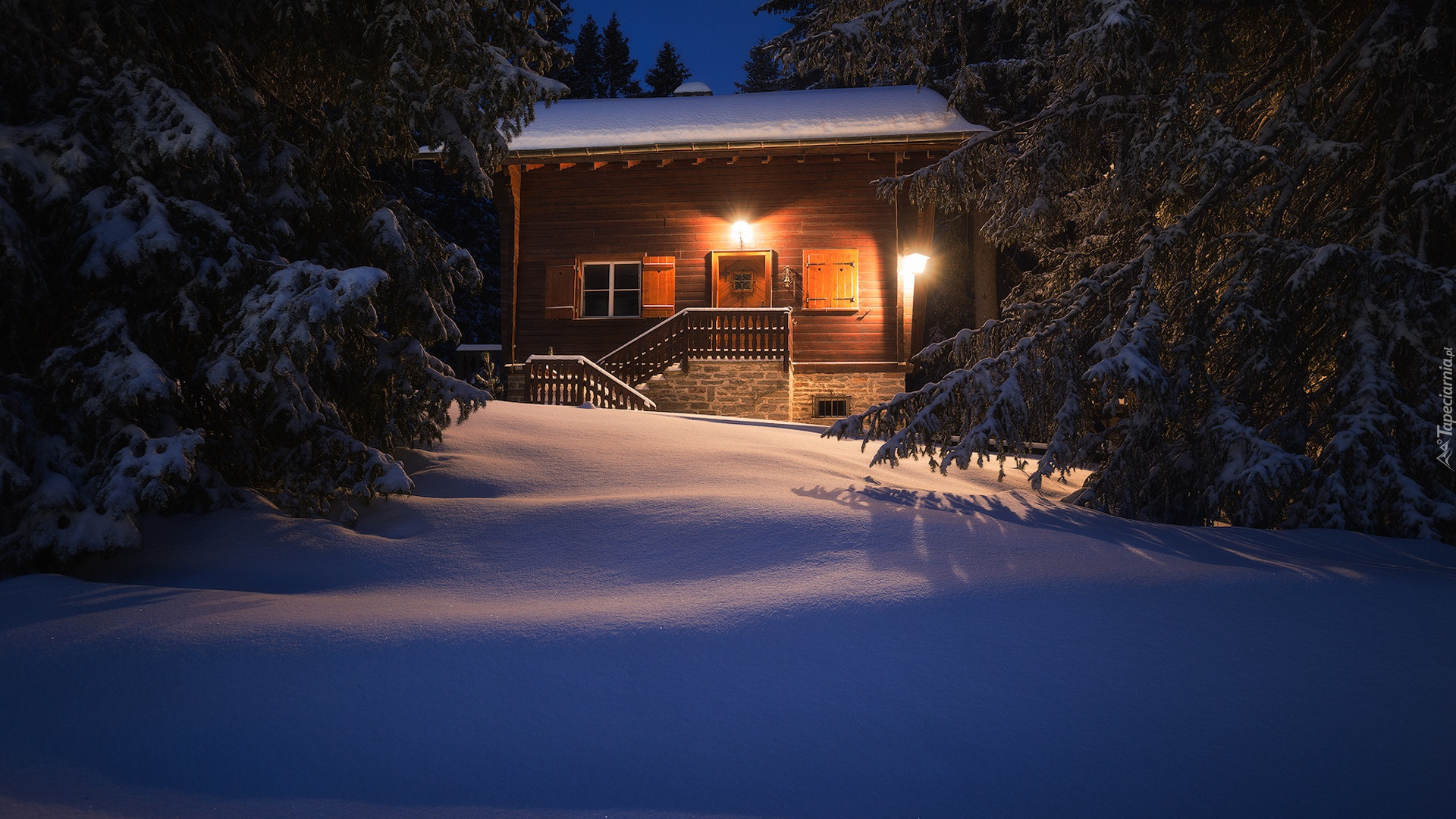 Edytor tapety: Oświetlony dom w lesie zimową porą