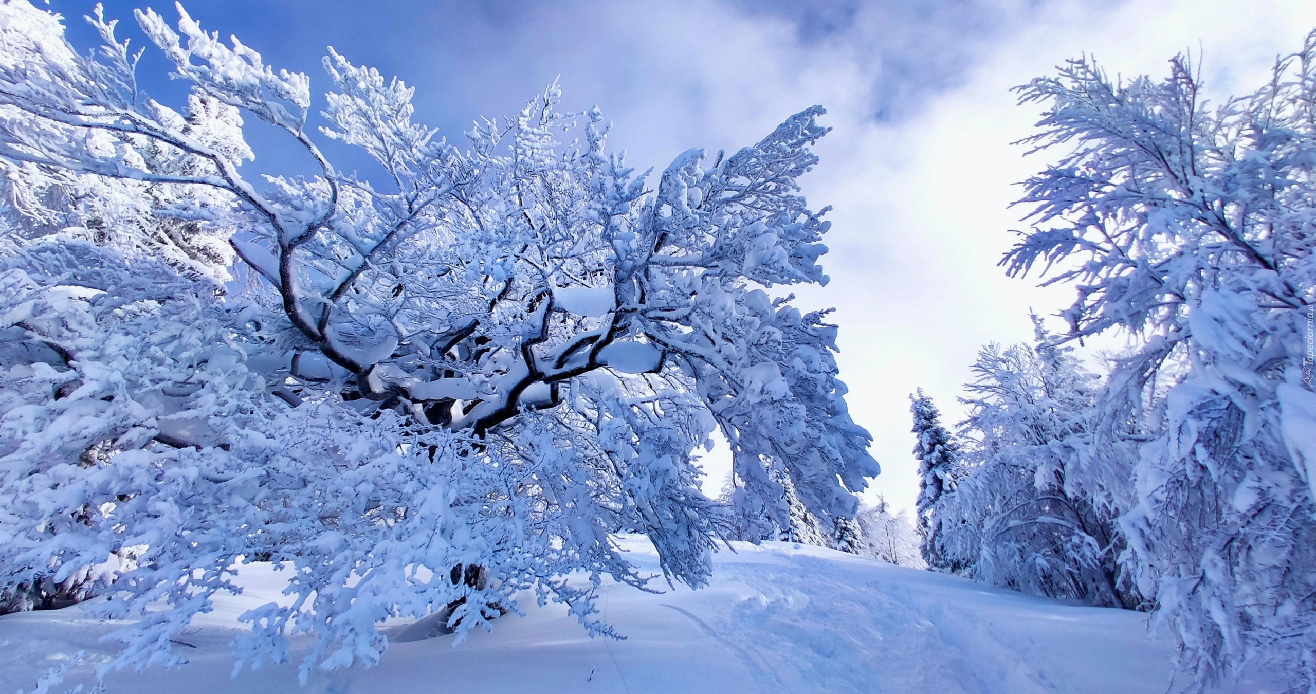 Edytor tapety: Ślady na śniegu pod zaśnieżonymi drzewami