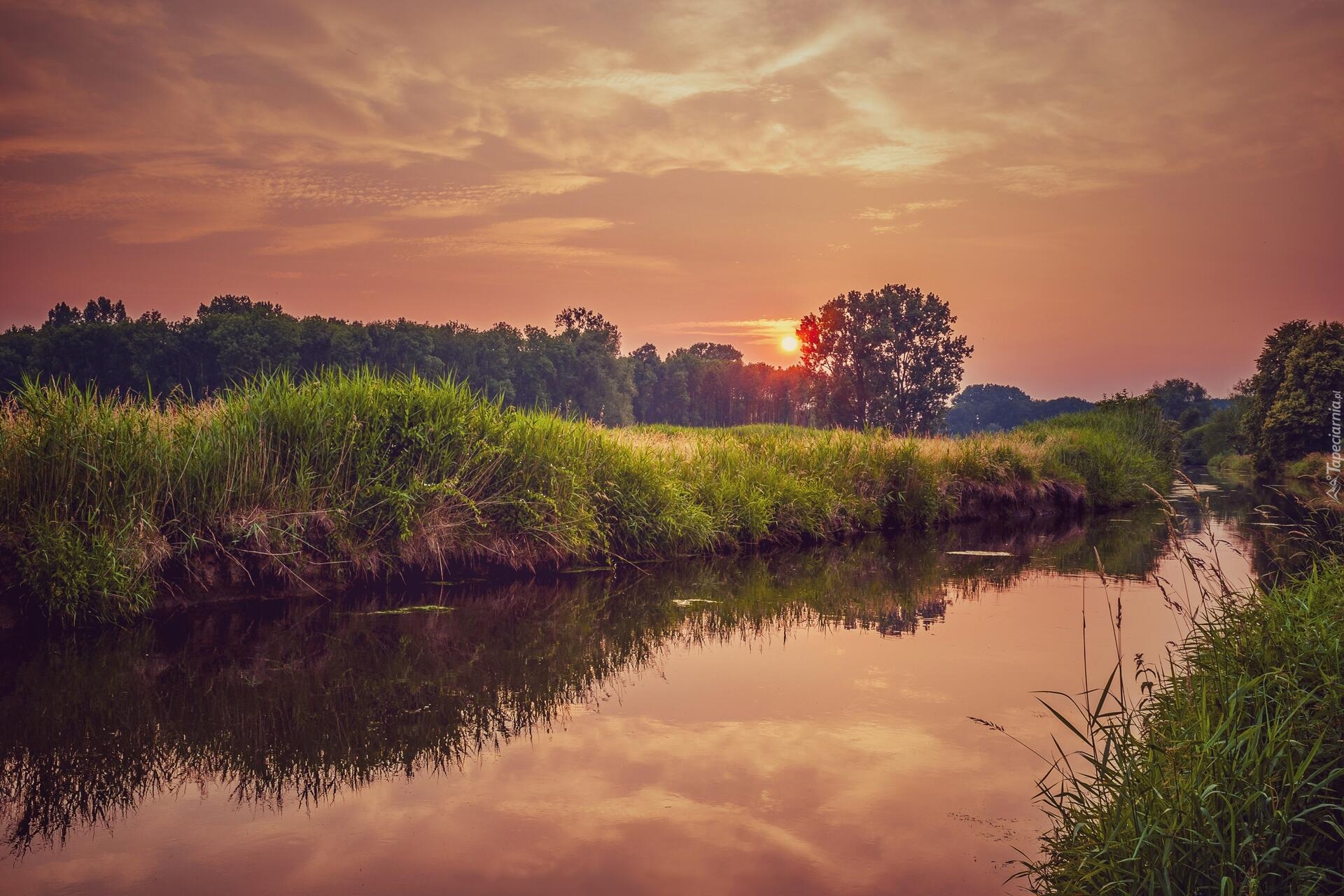 Edytor tapety: Drzewa i zielona trawa nad rzeką