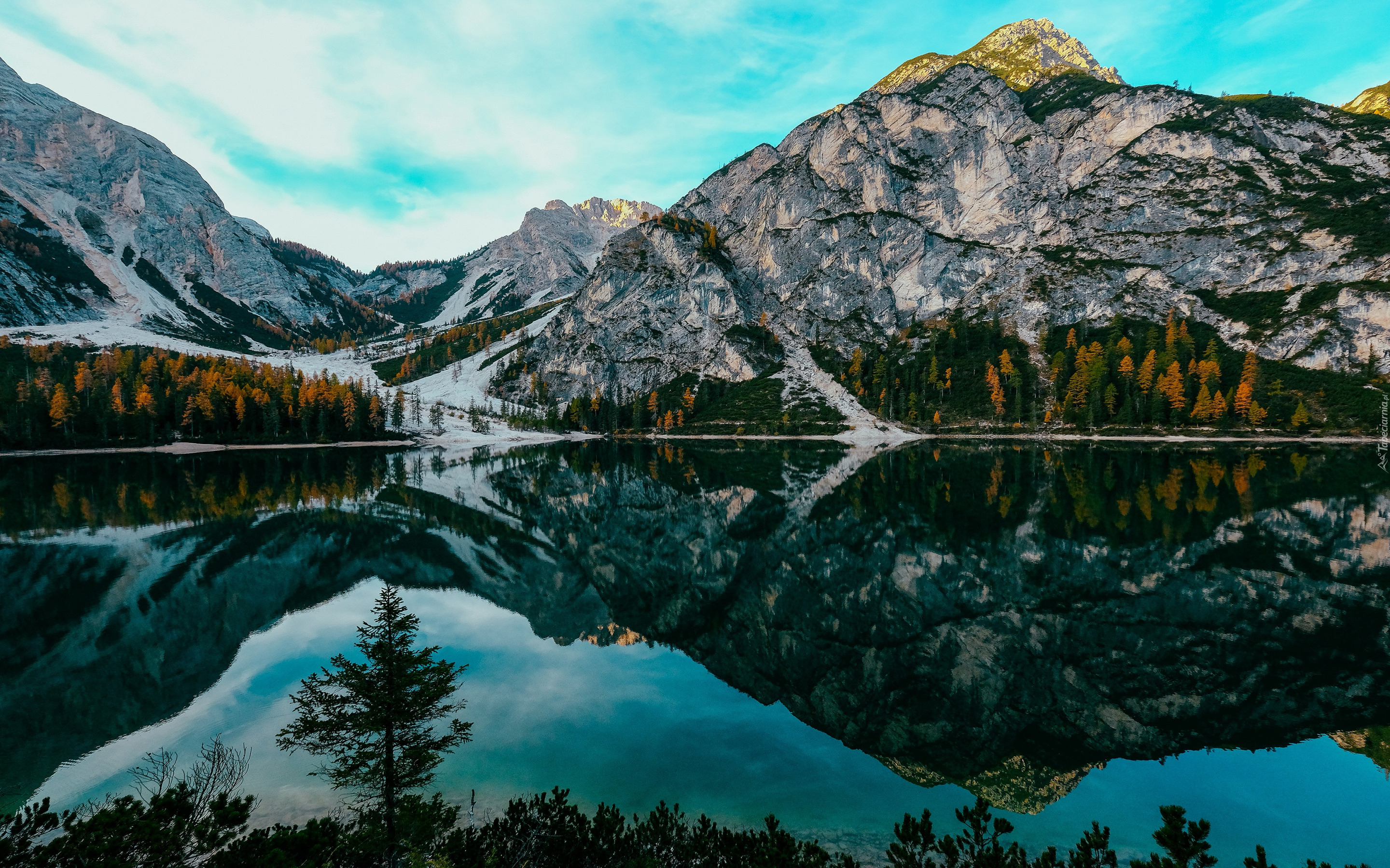 Edytor tapety: Odbicie gór i lasów w jeziorze