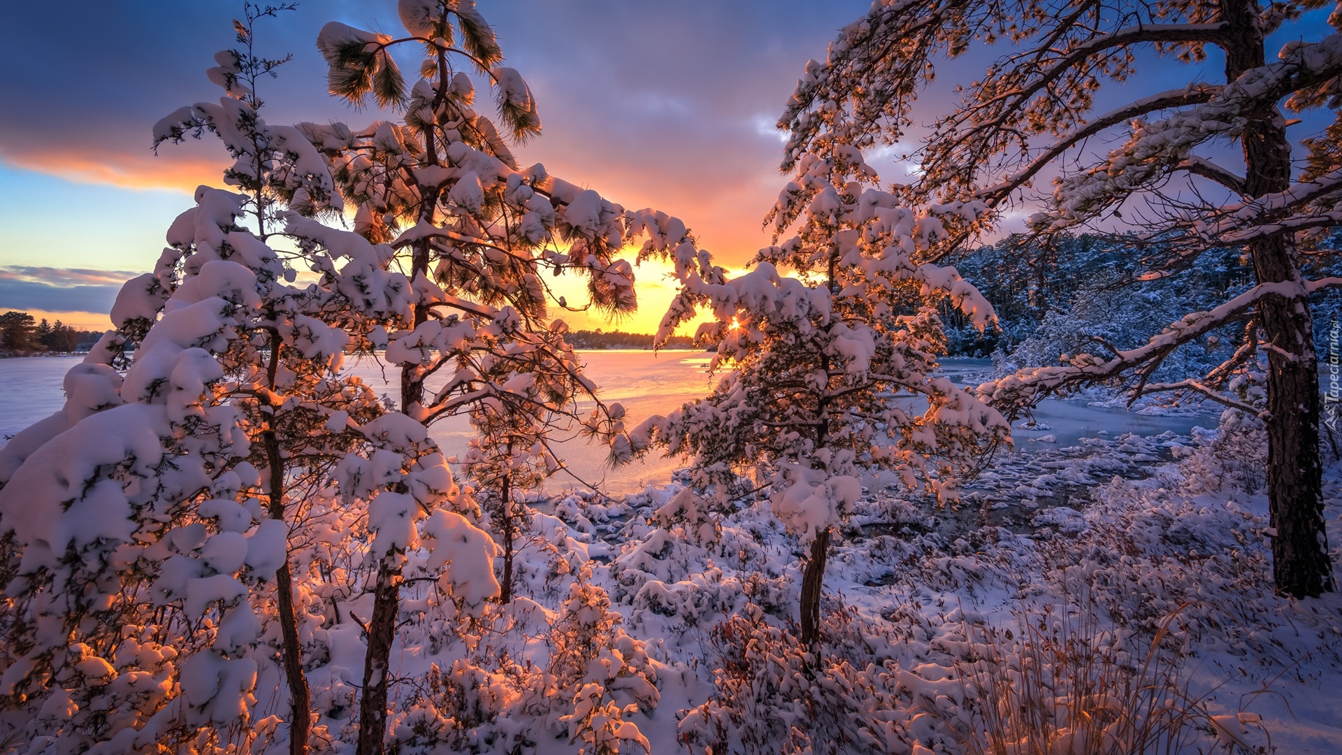 Edytor tapety: Ośnieżone drzewa nad jeziorem w blasku porannego słońca
