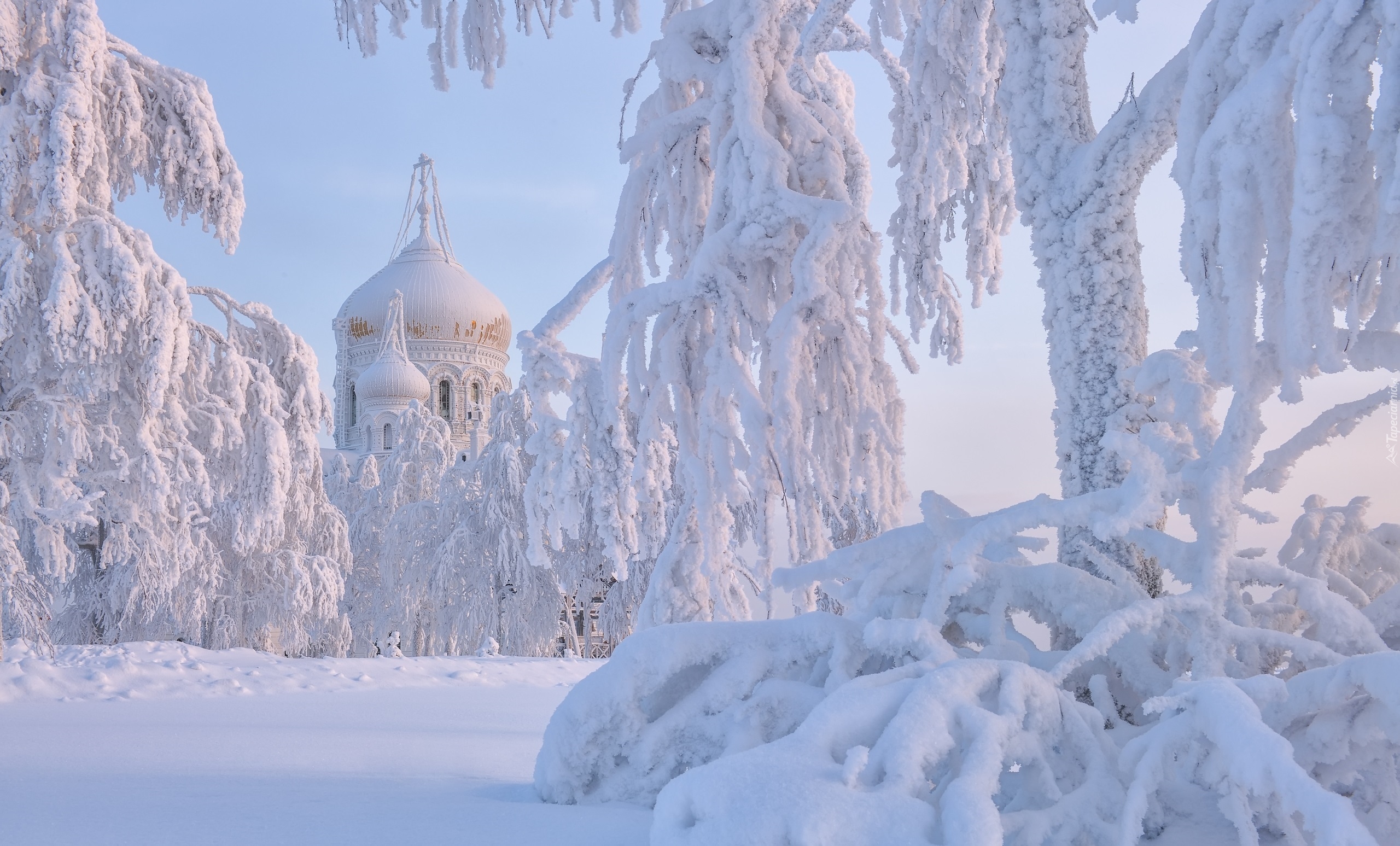 Edytor tapety: Ośnieżone drzewa i cerkiew w Białej Górze