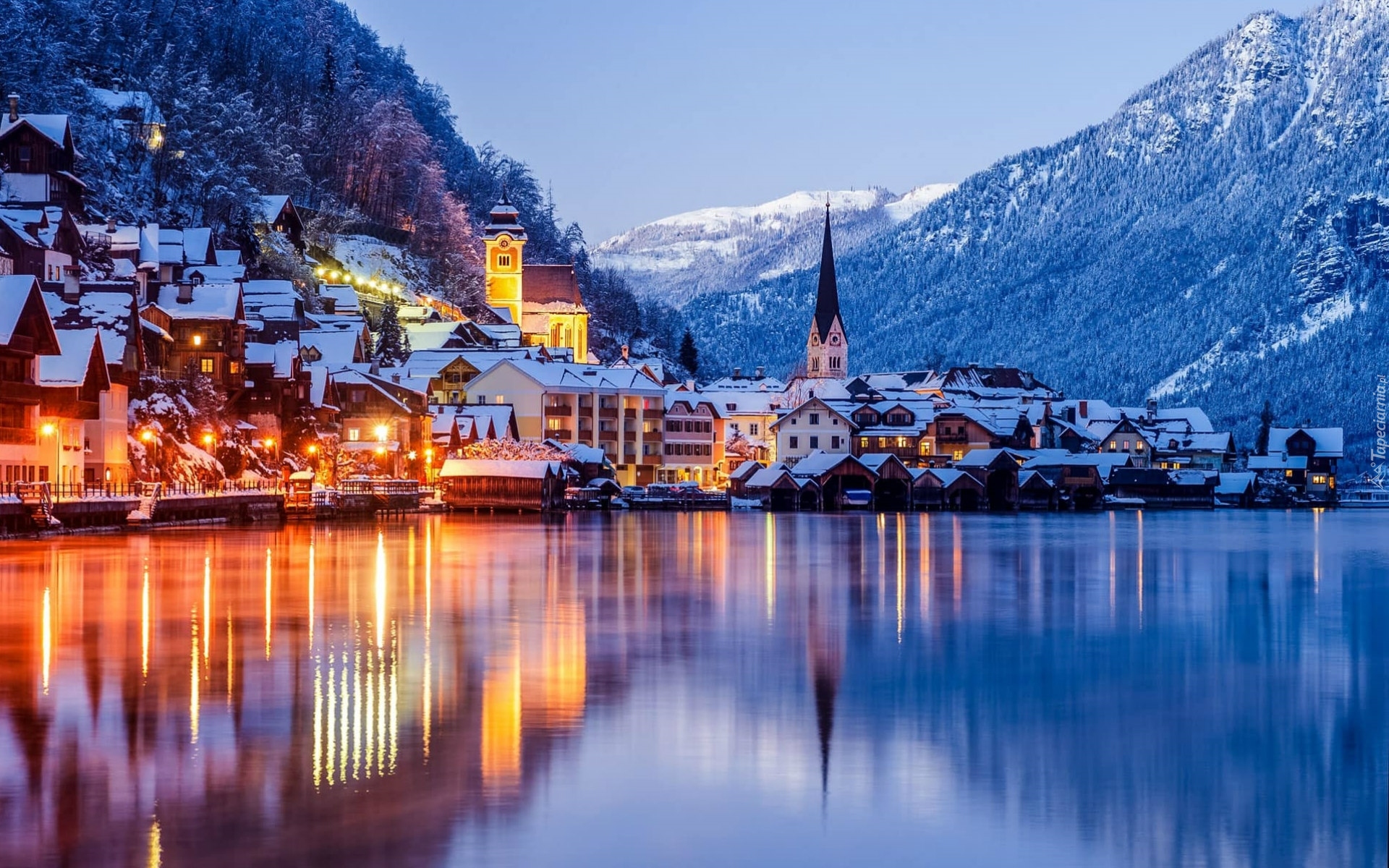 Edytor tapety: Domki i kościół nad jeziorem Hallstattersee