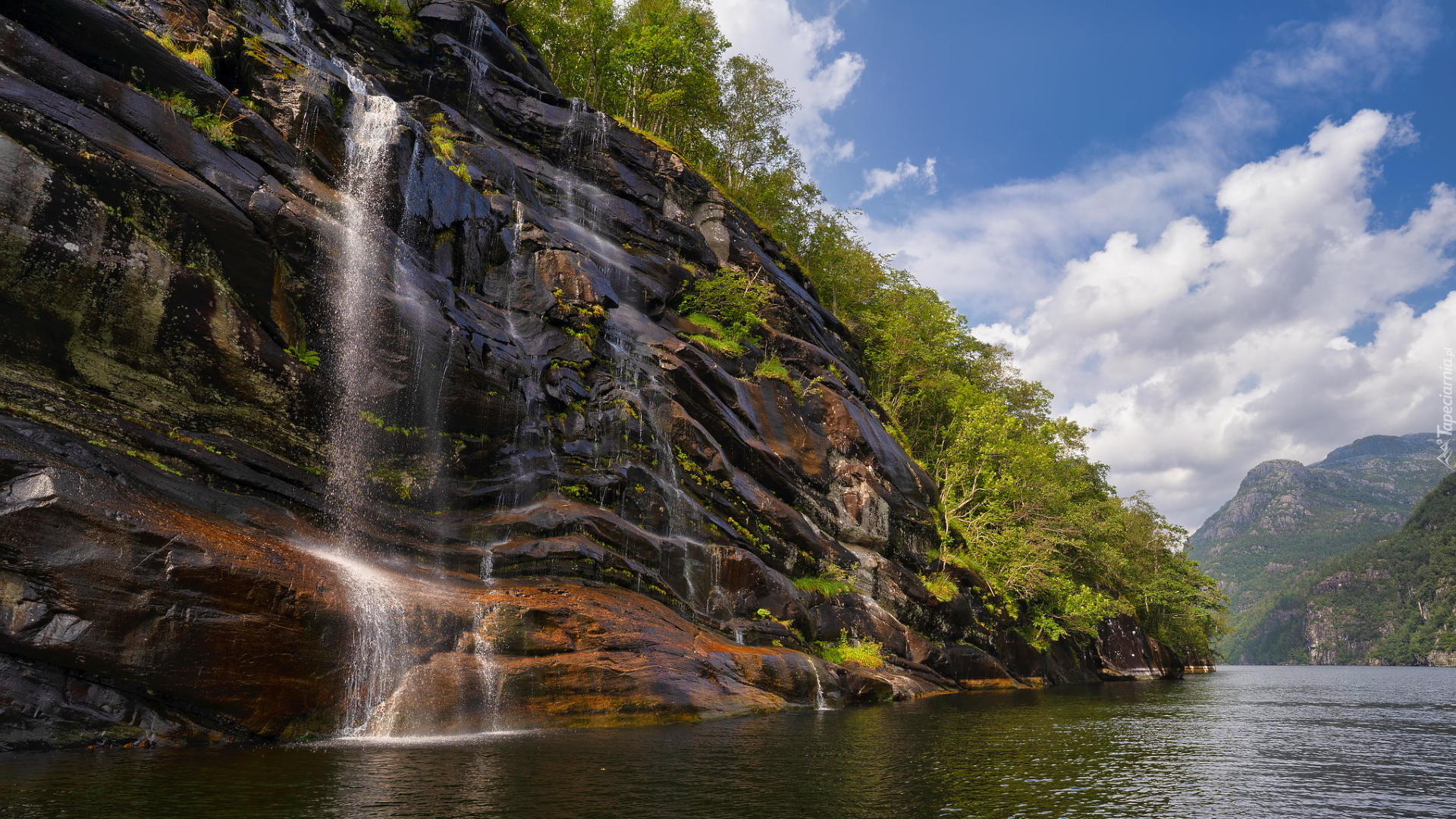 Edytor tapety: Wodospad na skałach wpadający do norweskiego fiordu Fyksesund