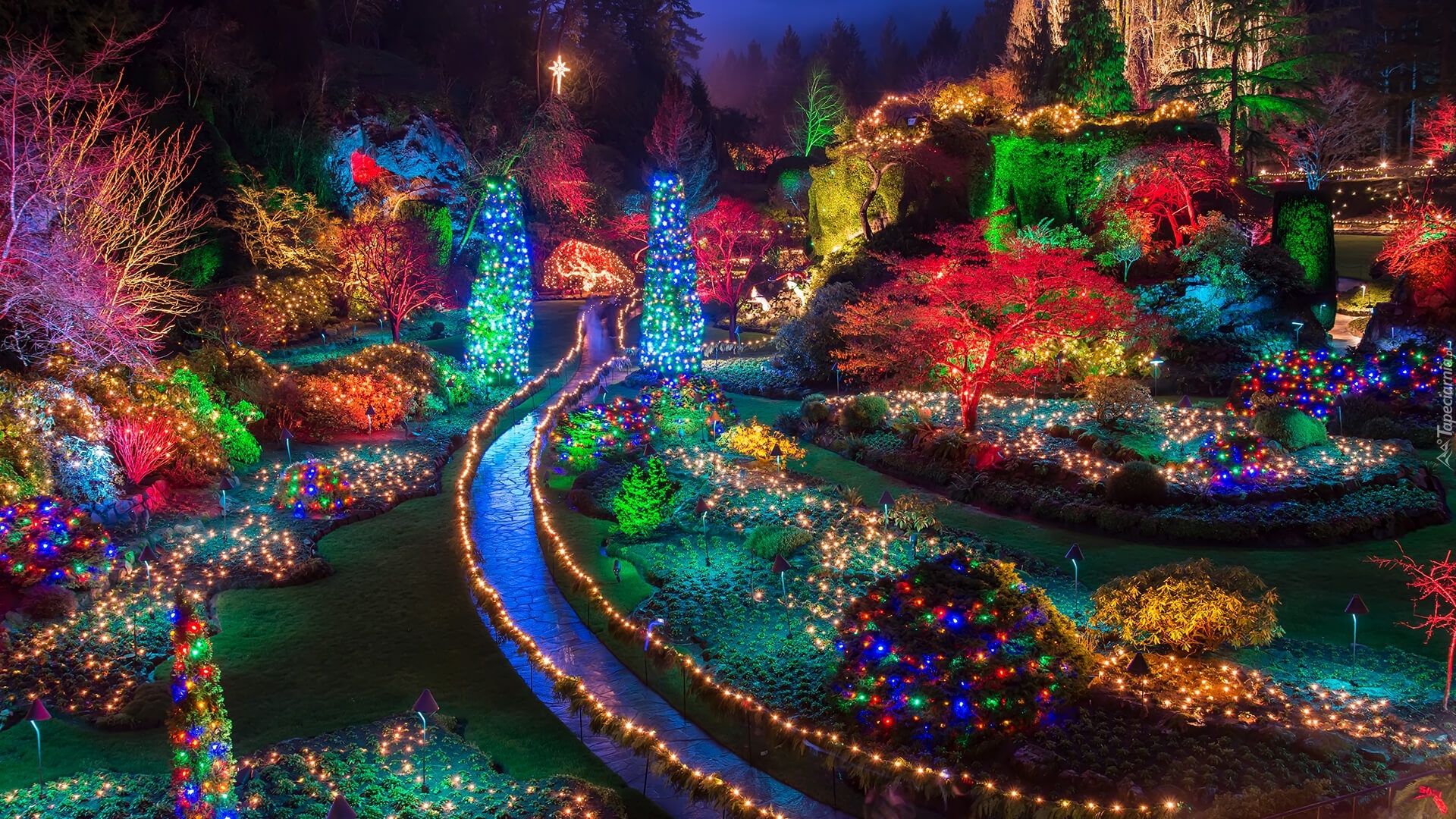 Edytor tapety: Oświetlony kolorowymi światełkami ogród w Brentwood Bay