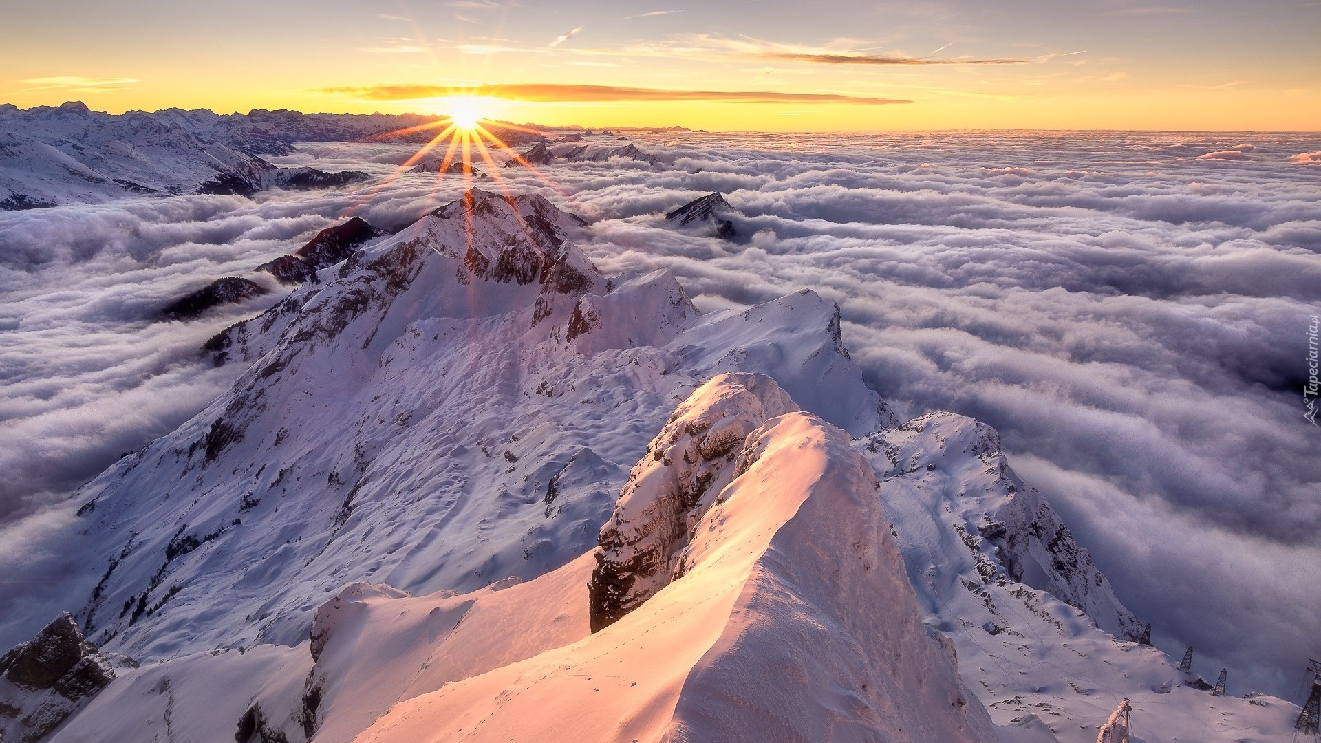 Edytor tapety: Opadająca mgła nad ośnieżonymi górami