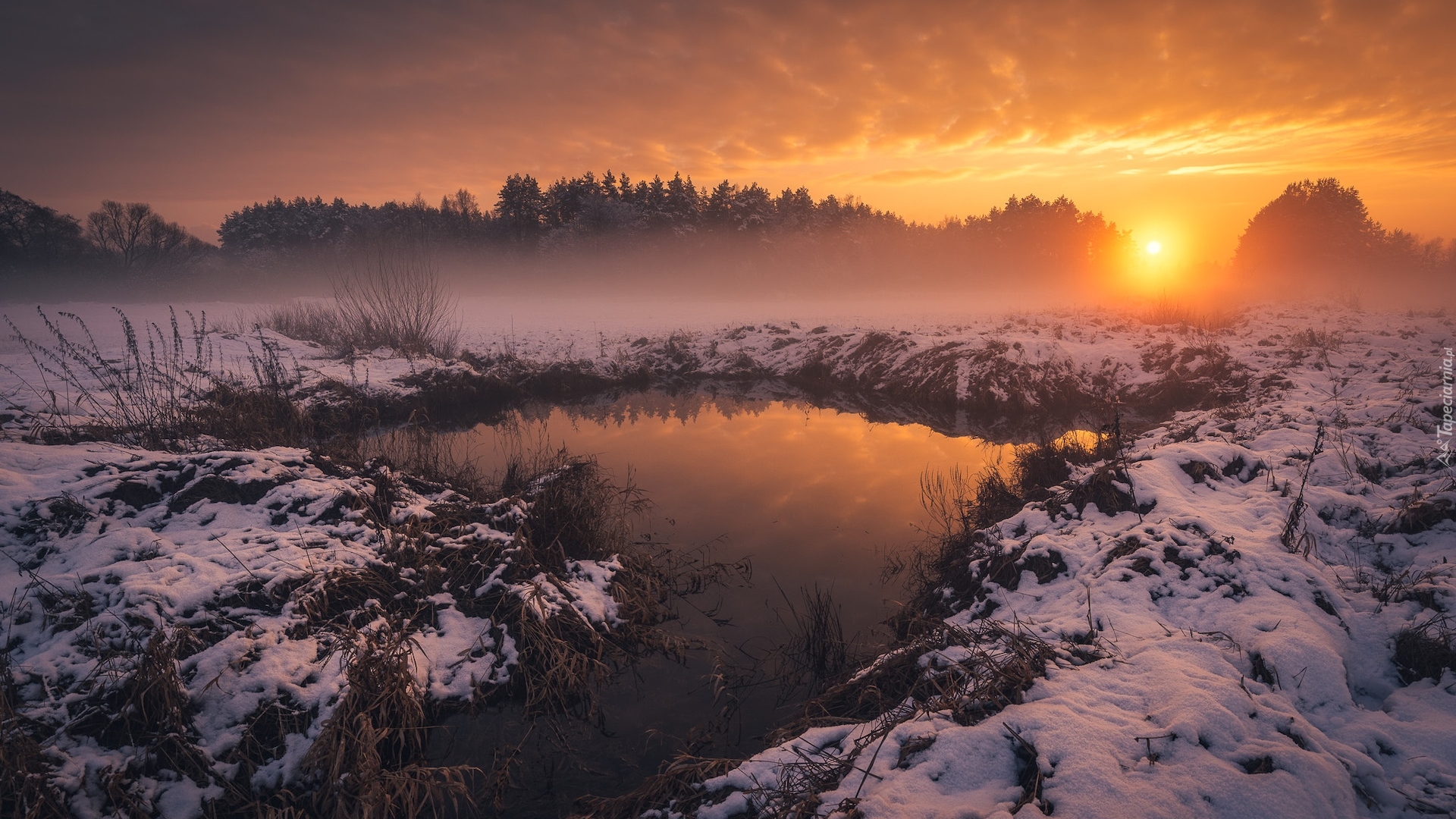 Edytor tapety: Zachód słońca nad ośnieżonymi brzegami rzeki