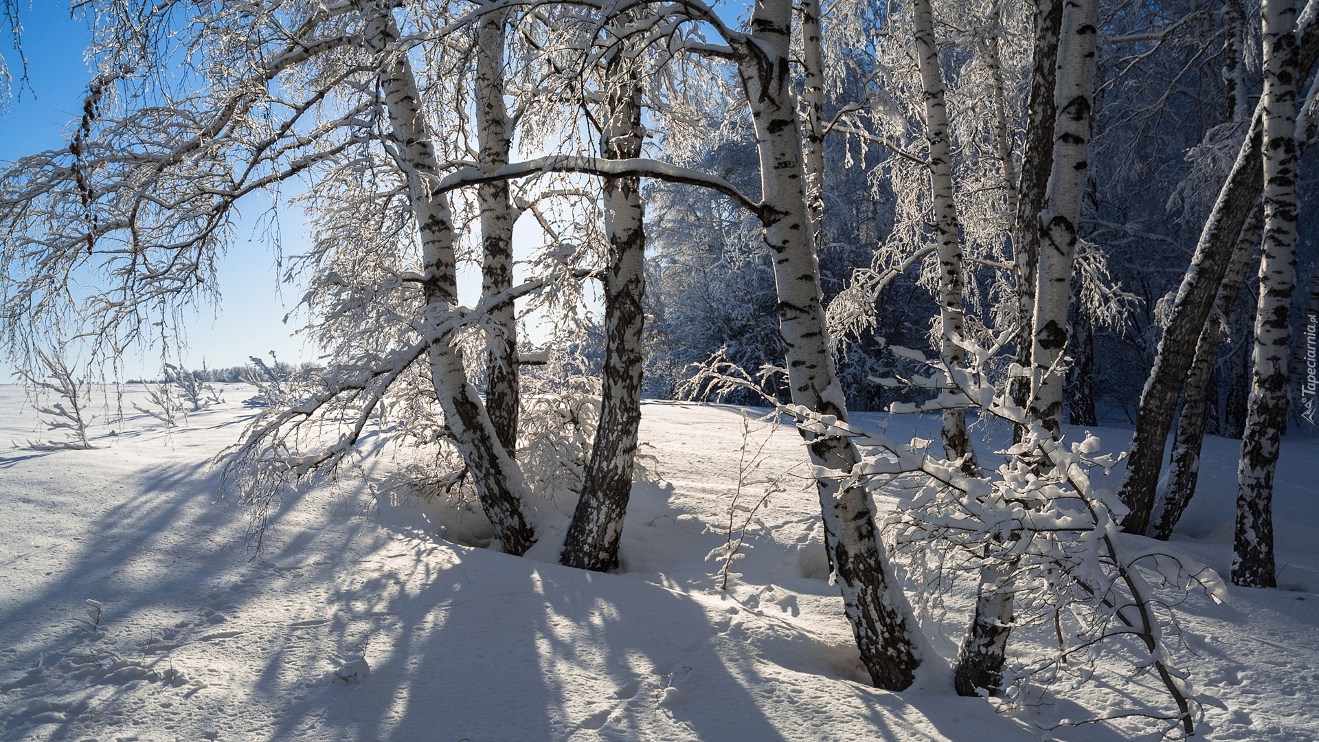 Edytor tapety: Ośnieżone brzozy w blasku słońca