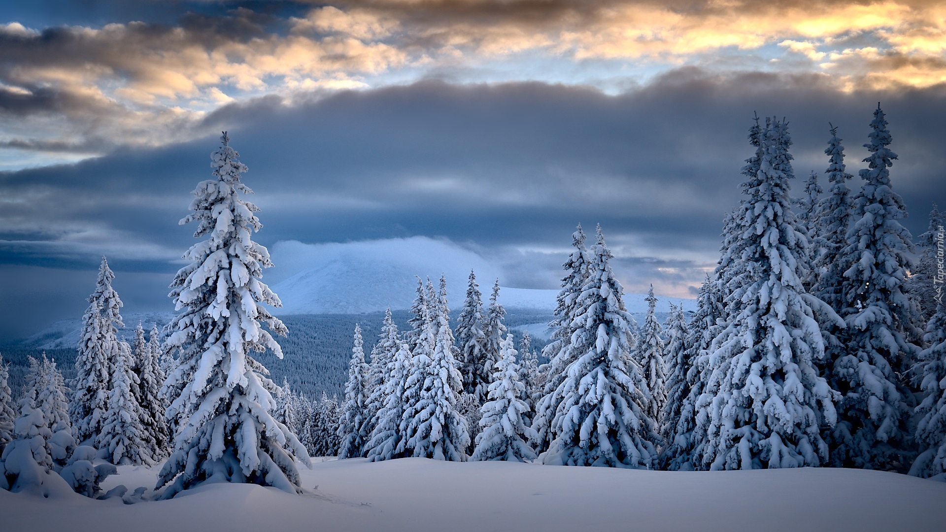 Edytor tapety: Ośnieżone drzewa w zaspach na tle pochmurnego nieba