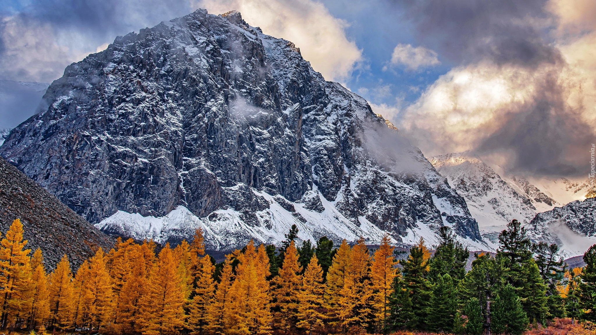 Edytor tapety: Pożółkłe drzewa na tle góry