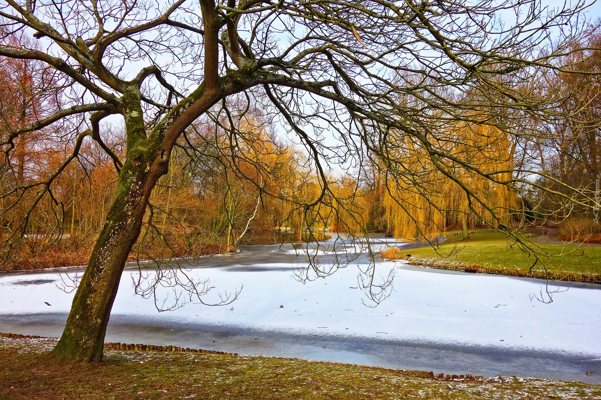 Edytor tapety: Pożółkłe wierzby nad zasypanym śniegiem stawem
