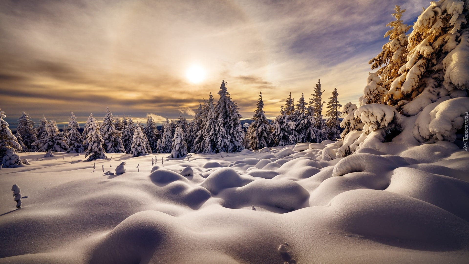 Edytor tapety: Ośnieżone drzewa i zaspy w blasku słońca