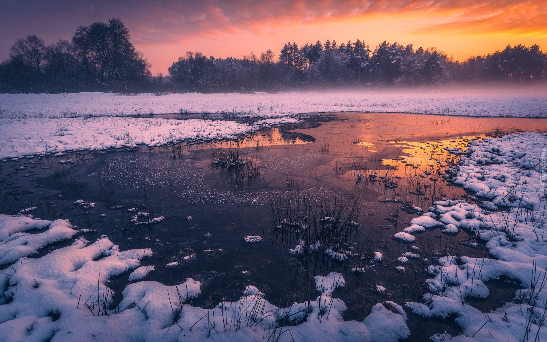 Edytor tapety: Mgła nad zamarzniętym i ośnieżonym jeziorem