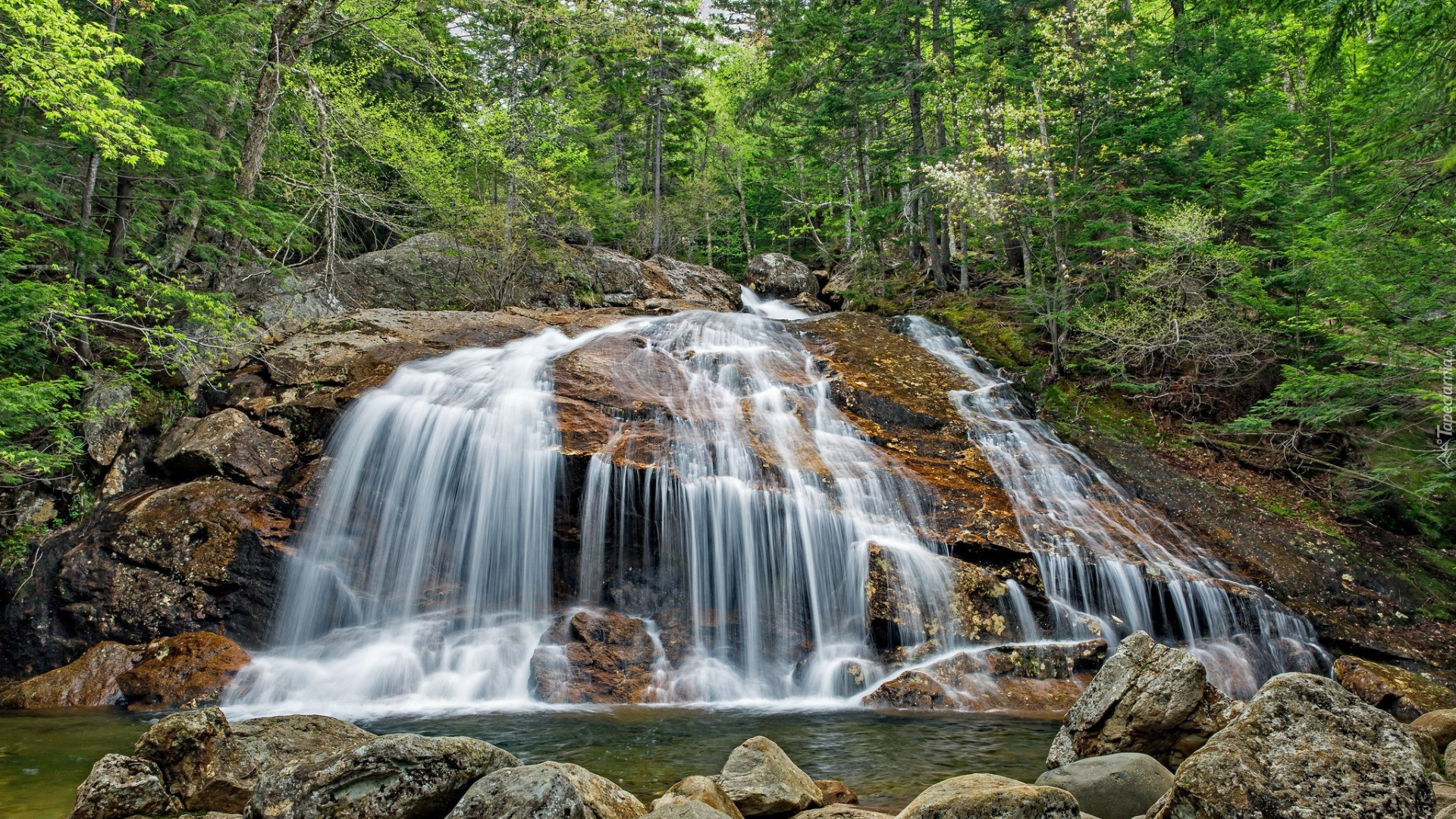 Edytor tapety: Skały i kamienie pod wodospadem w zielonym lesie